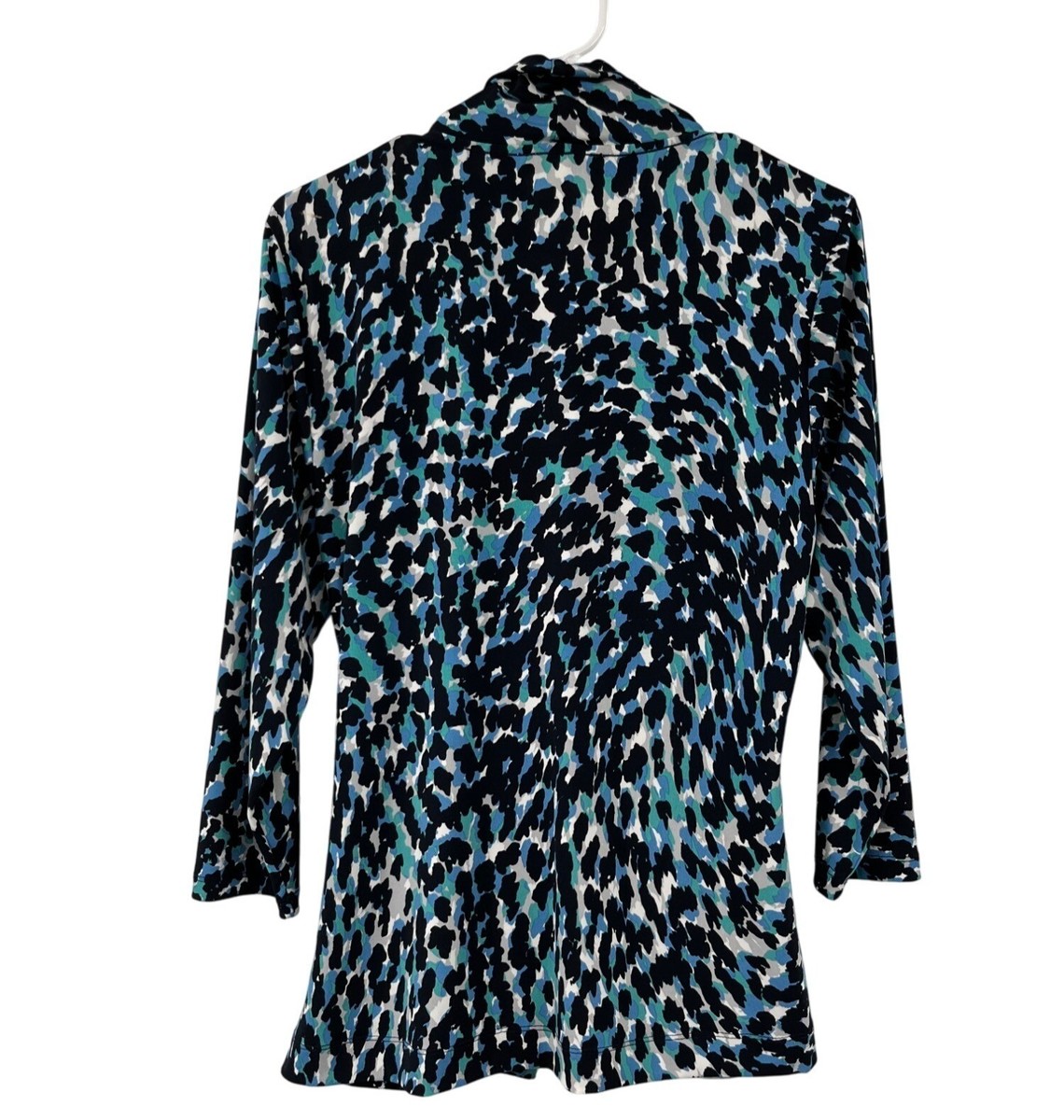 chaus new york, blouse, womens top, xl, blue print, abstract pattern, surplice neckline, ruched side, 3/4 sleeve, stretchy top, pullover blouse, travel wear, office blouse, machine washable, comfortable top, versatile blouse, work to weekend, career, casual