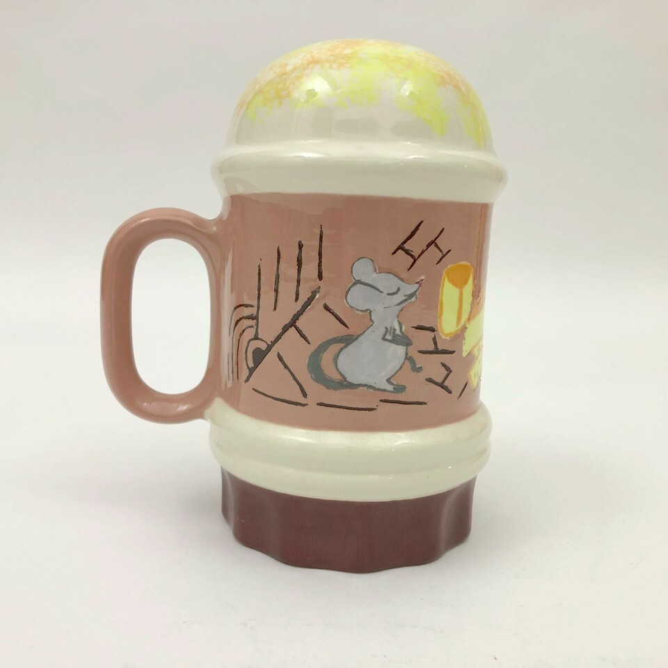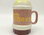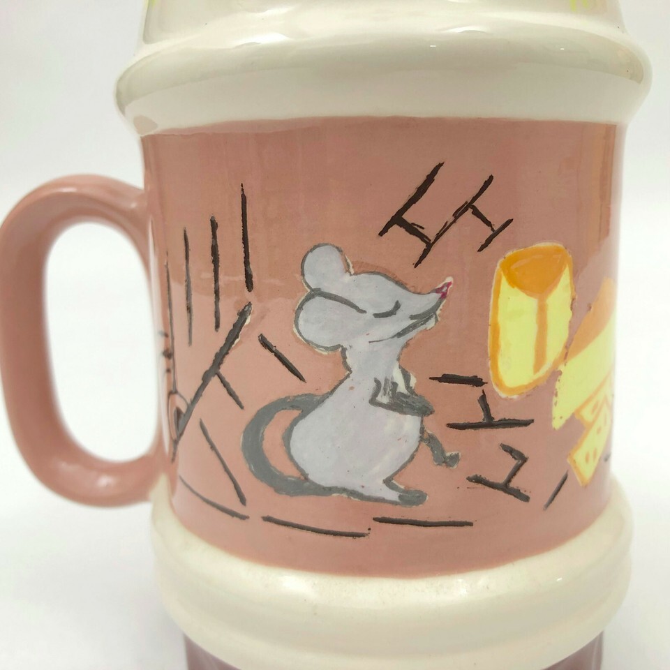 This is a EUC cheese shaker hand made by KS, signature, in 1975 on the bottom. It features a cute mouse, slices of cheese, and "Cheese" in large ornate letters on the body of the shaker. There are decorative black abstract lines as an accent.