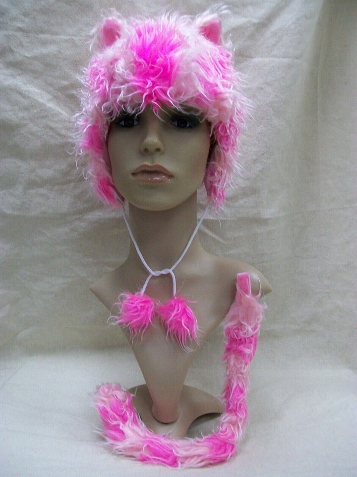 - Cheshire Cat Pink Striped Furry Kitty Hat w Ears & Tail Anime Alice n Wonderland