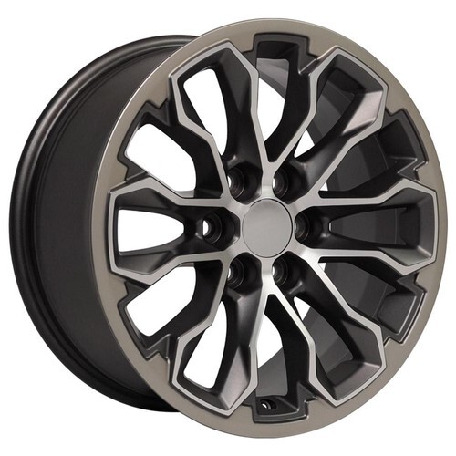 The finish on this wheel is achieved through several different phases. The finishing process begins with a gunmetal powder coat applied to the wheel. The face of the wheel is then precision machined using a coolant and ceramic bit. This method leaves the gunmetal powder coat in the recessed areas between the spokes while creating a fine machined aluminum appearance on the face of the wheel. The wheel is then carefully masked-off, leaving only select surfaces exposed for the application of the multi-tone finish. The final stage consists of clear coat for added protection.
