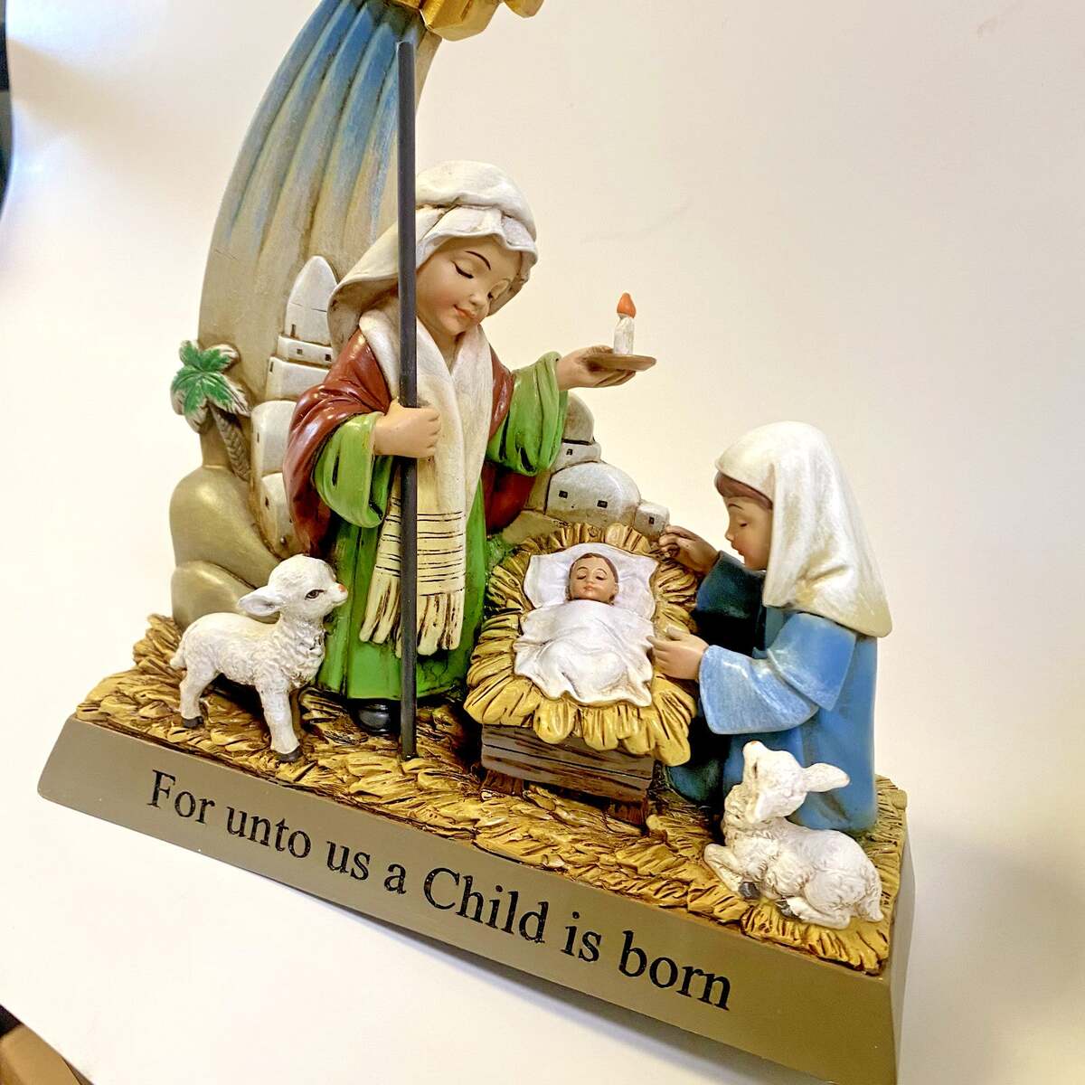 You are purchasing a beautiful figurine with an image of the Nativity Scene with child like Blessed Mary, Saint Joseph, titled " For unto us a Child is Born.