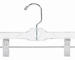 Children's 10" clear Pant/Skirt hanger, perfect for infants and babies. Space saving flat body with a chrome hook and notches for straps. Adjustable clips with soft rubber cushions.