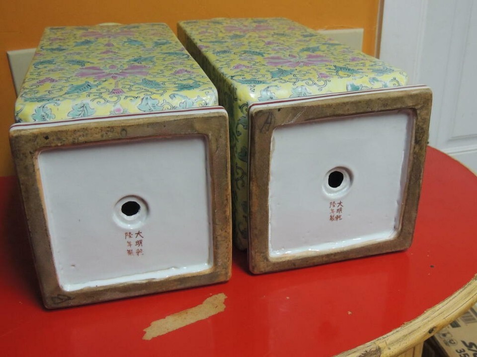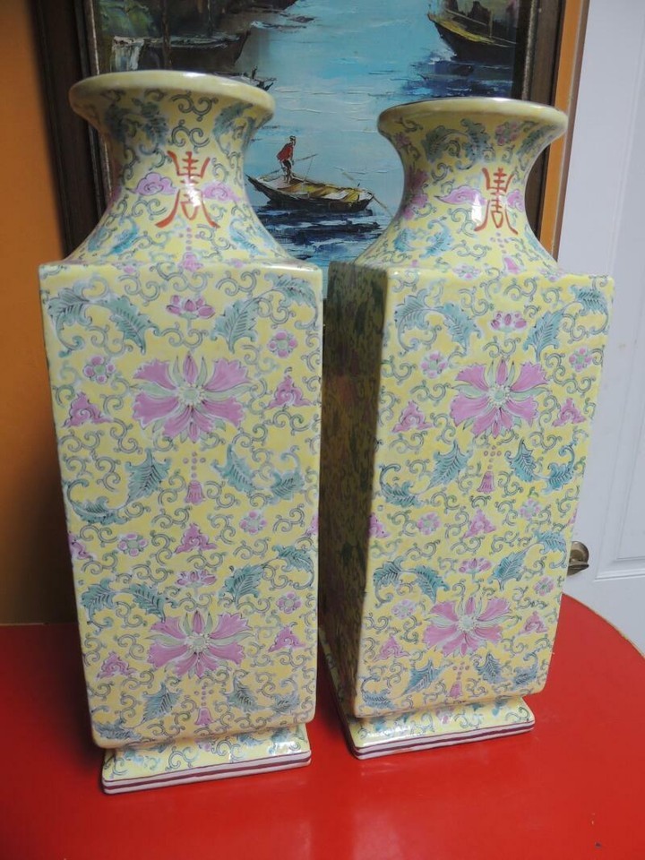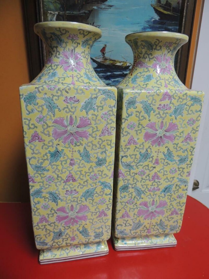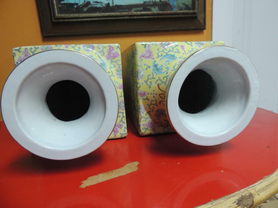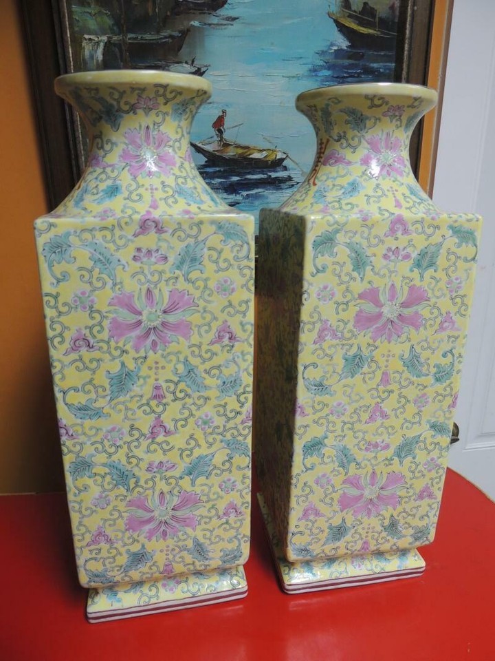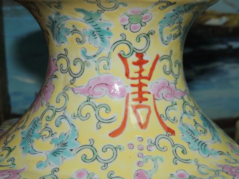 TWO VASES THAT HAVE BEEN USED AS A LAMPS (IT APPEARS TO HAVE BEEN MADE FOR EITHER PURPOSE WITH A "POP-OUT" AREA FOR USE AS A LAMP). PURCHASED AT THE ESTATE OF A LOCAL COLLECTOR OF CHINESE ANTIQUES. I AM NOT AN EXPERT, BUT I BELIEVE THIS IS 75-100 YEARS OLD, HAVING MANY OF THE FEATURES OF AGING POTTERY. PLEASE LOOK AT THE PICTURES CAREFULLY.