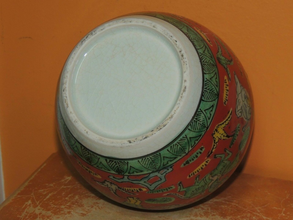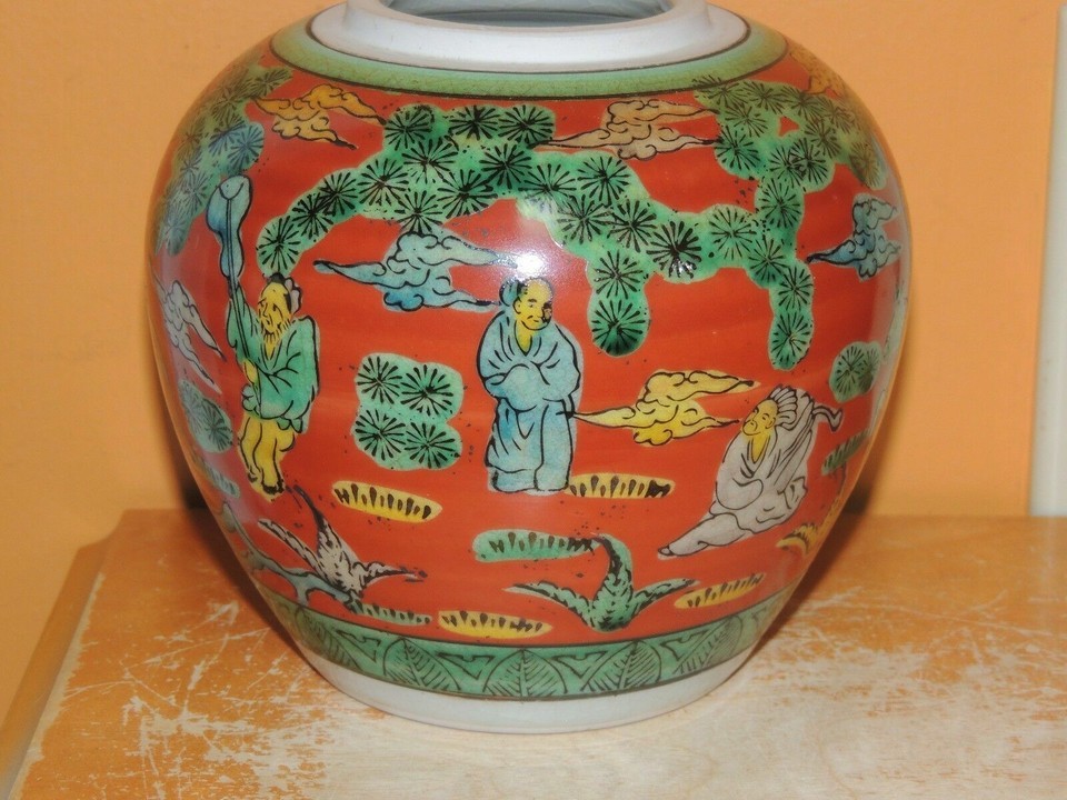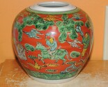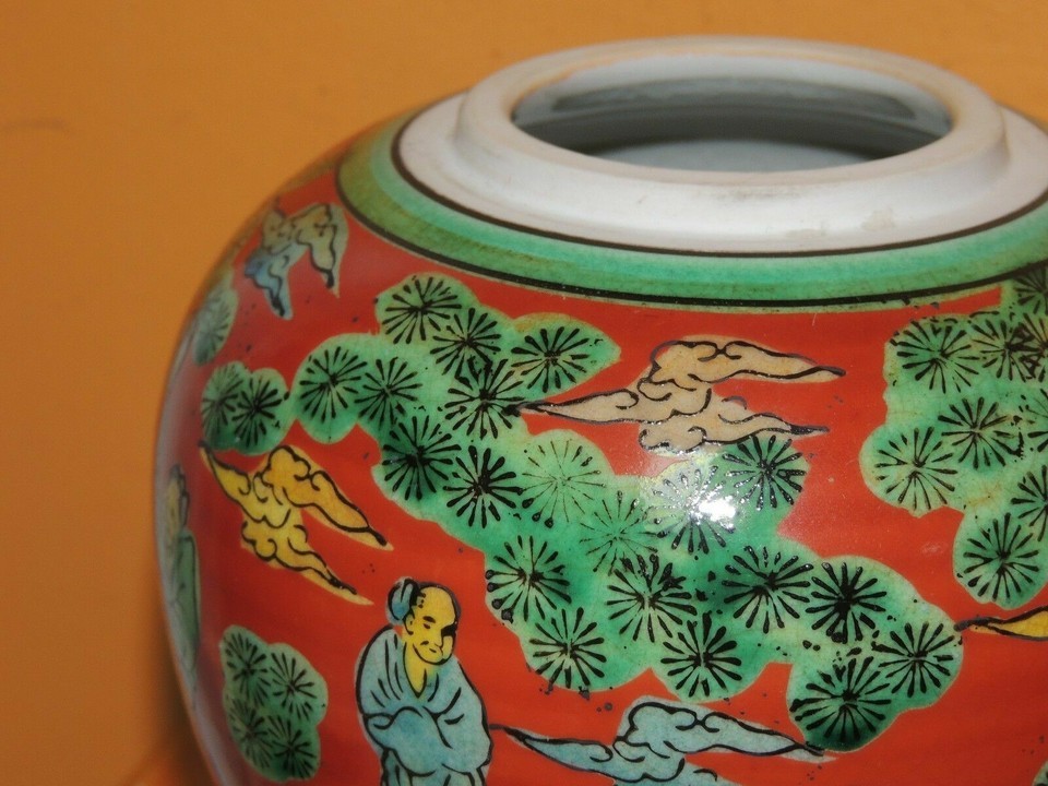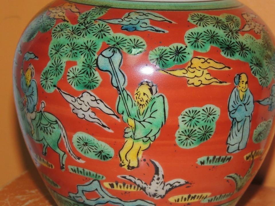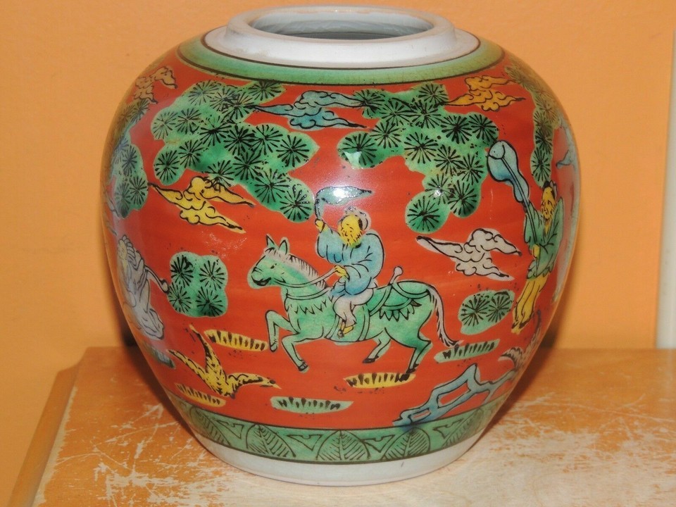 - Chinese 5" Jar Red & Green horse rider attendant with fan unknown Vintage