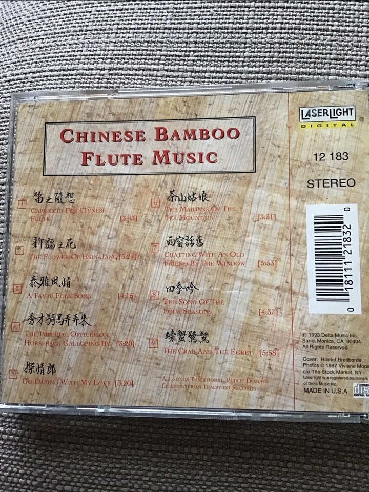 This CD features a collection of traditional Chinese music performed by various artists. The focus of the album is on bamboo flute music, with a total run time of 40 minutes. The album was released in 1993 by Laserlight record label and is a great addition to any world music collection. The CD is in the format of a jewel case and is in excellent condition.