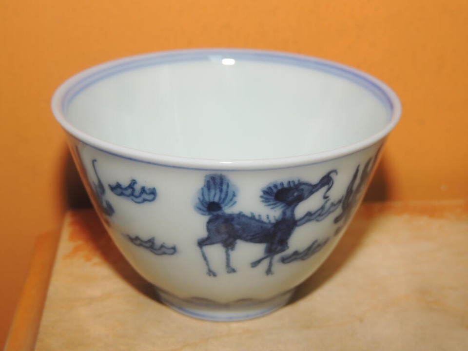 Chinese Cup 3.25 blue white Qilin engraved mark poss Ming/ Qing Antique/ Vintage