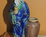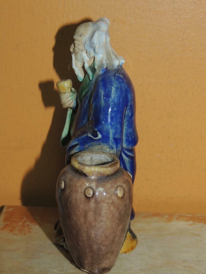 - Chinese Mud Man 4.5"+ blue yellow robe w wine jar cup Mudman Men Antique c 1910