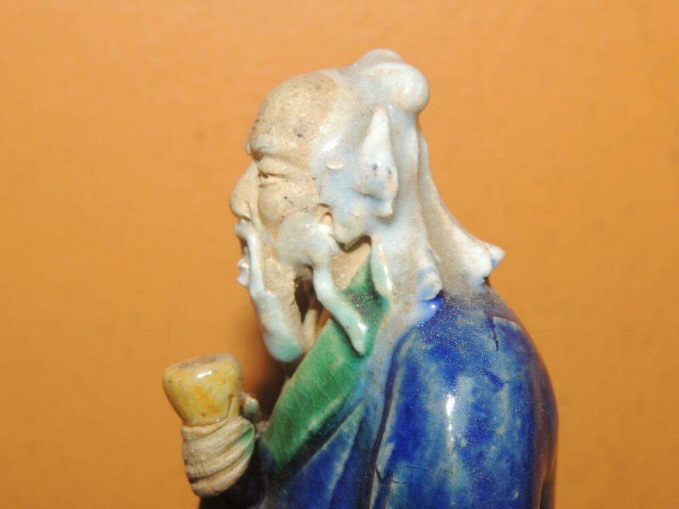 Chinese Mud Man 4.5"+ blue yellow robe w wine jar cup Mudman Men Antique c 1910