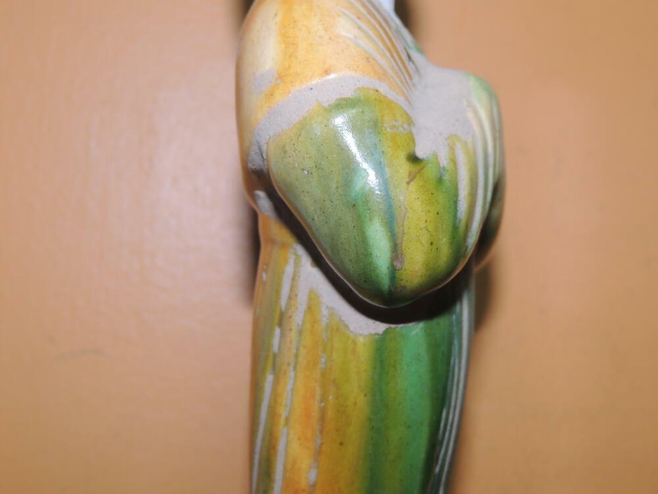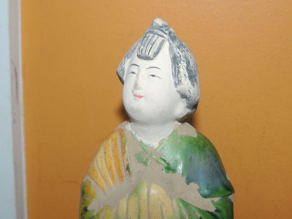 - Chinese Terracotta Mud Woman Standing 8.5" Sancai drip glaze yellow green mudman