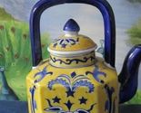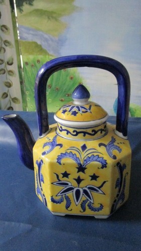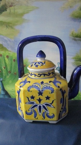 - CHINESE YELOW BLUE TEAPOT CERAMIC HANDLE 1950s 9 X 7" [TP6]