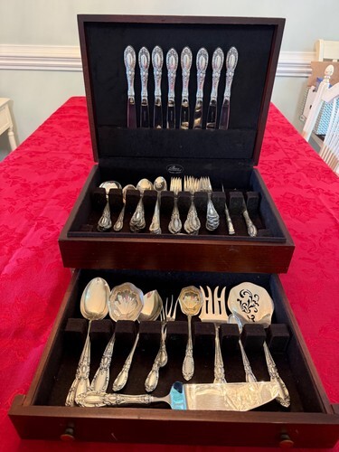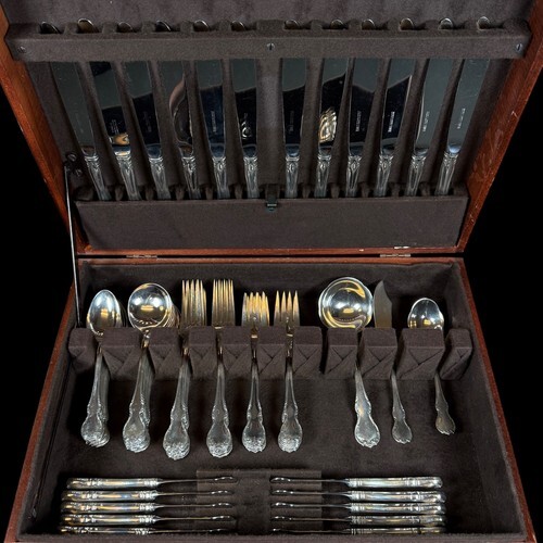 COMPLETE FLATWARE SETHOSTESS HELPERSHOLLOWWARE / TEA SETSMUSEUM QUALITY/FIGURAL SILVERFINE ESTATE VINTAGE JEWELRYMID-CENTURY MODERNSILVER FLATWARE SILVERWAREBuccellatiChristofleGeorg JensenNew Georg Jensen HollowwareNew Georg Jensen JewelryGorhamInternationalLuntMichael Aram - NewReed BartonTiffany Co.TowleWallaceWhitingPLACE SETTINGS