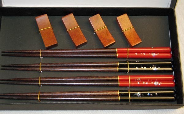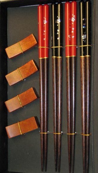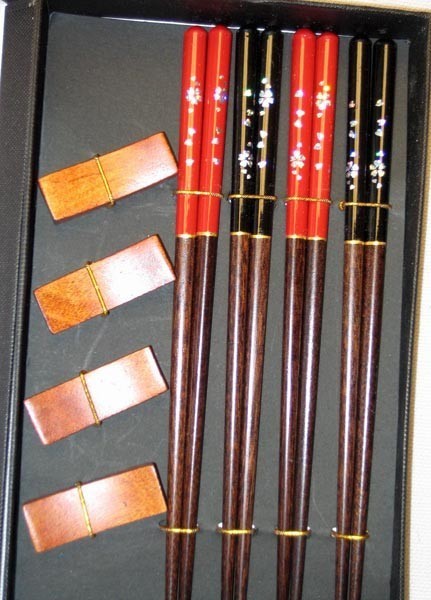 - Chop Sticks w/ Wooden Rests Set For 4 New Enamel Flowers Presentation Gift Box