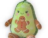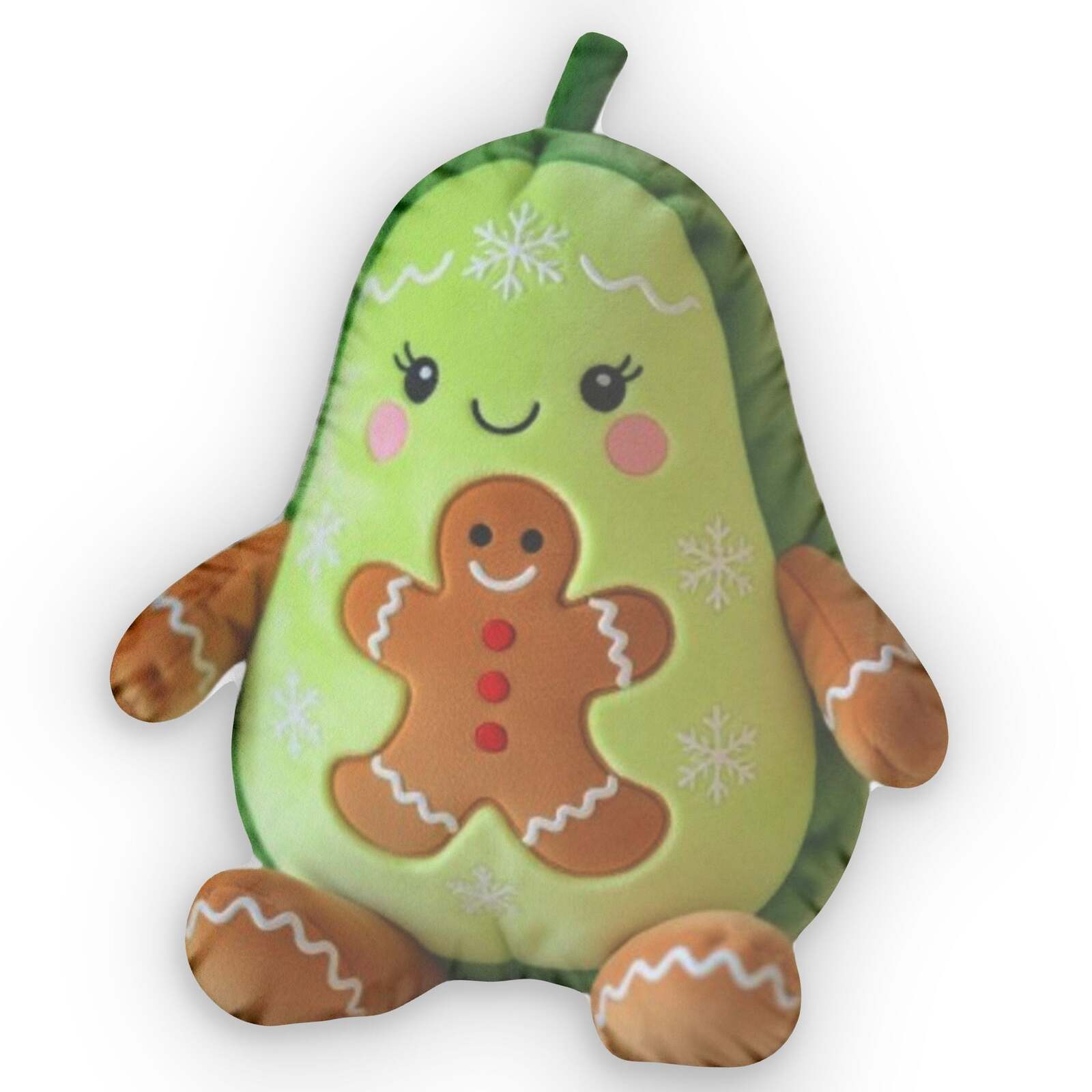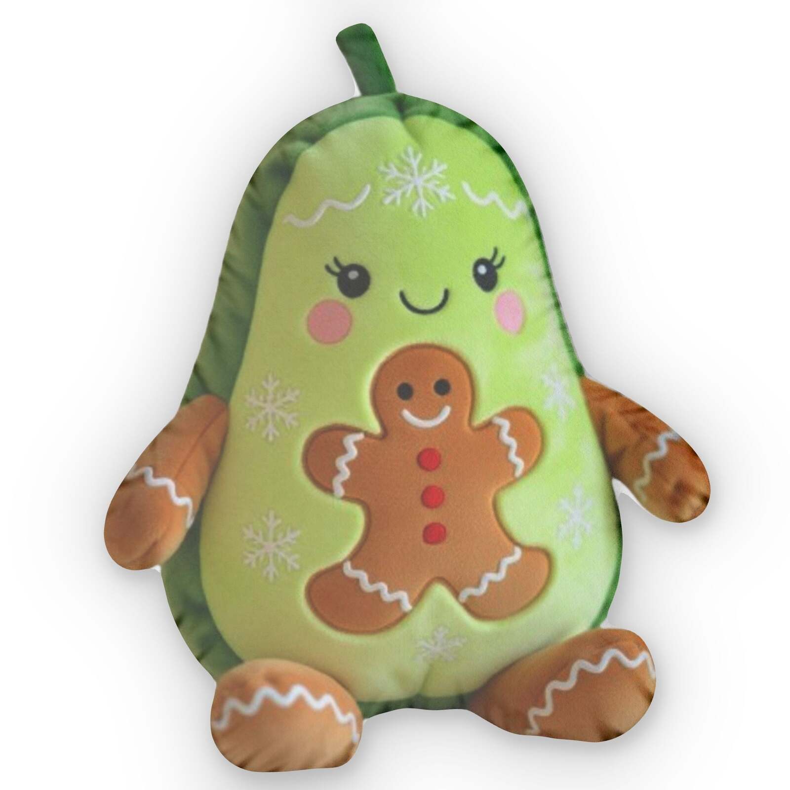 A vintage-style collectable Christmas avocado plushie pillow with a special design, captured in a soft-focus, dreamy perspective highlighting its intricate, hand-painted gingerbread motifs. This unique pillow will add a whimsical touch to your holiday decor, perfect for avocado lovers and collectors alike.