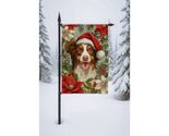 Charming 12x18 holiday garden flag featuring a brown and white Border Collie wearing a Santa hat, surrounded by poinsettias, white flowers, holly berries, and greenery. This festive design adds warmth and personality to any outdoor space, perfect for dog lovers and Christmas enthusiasts alike. Made from durable, weather-resistant fabric to keep colors bright all season.