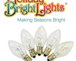 Holiday Bright Lights C7 clear incandescent replacement bulbs deliver classic, warm illumination for traditional Christmas light strings. Each 5-watt bulb produces a bright, sparkling glow ideal for vintage-style holiday displays on trees, eaves, and outdoor decor. Designed for easy snap-in replacement, these UL Listed bulbs ensure safe, reliable performance season after season. Their compact C7 size and clear glass casing enhance light clarity and reflectivity, making them a trusted choice for restoring or maintaining the charm of existing incandescent light sets.