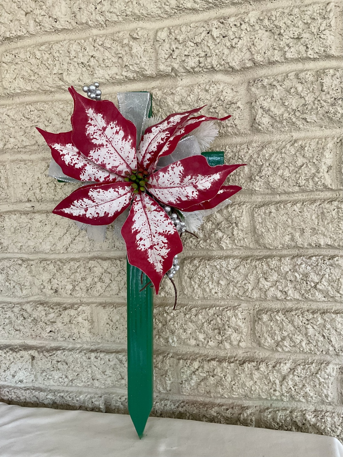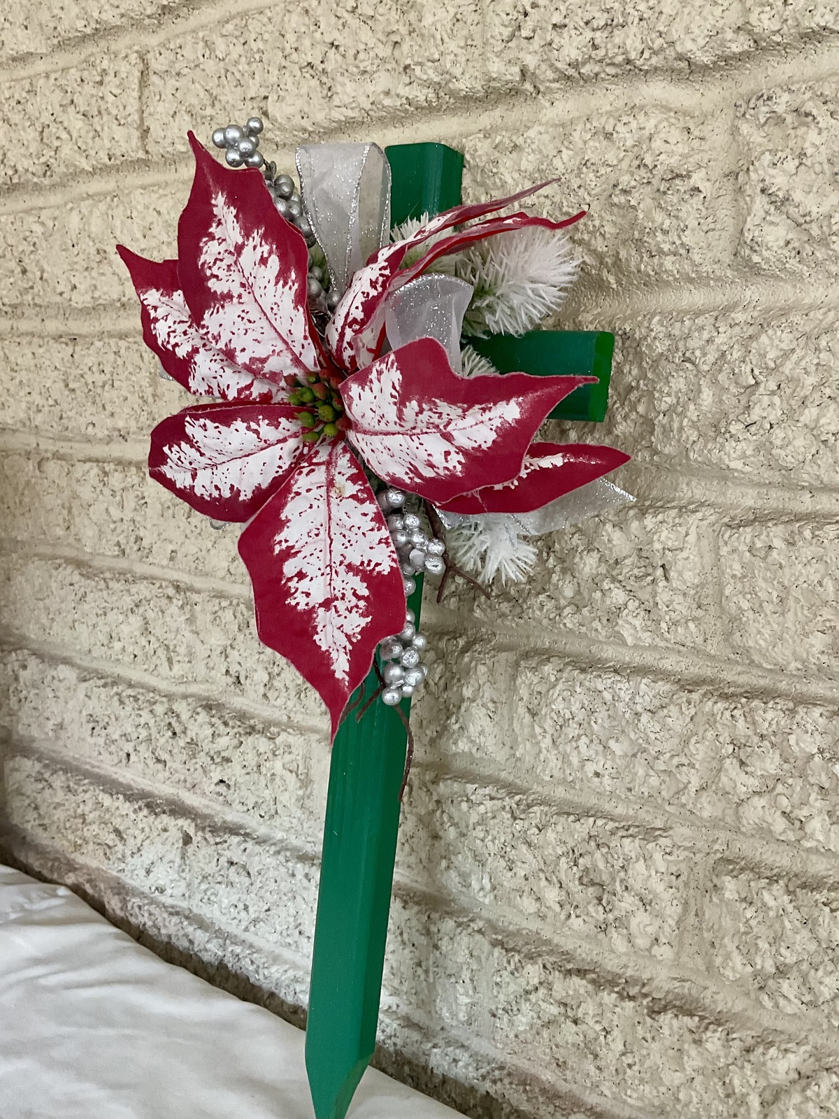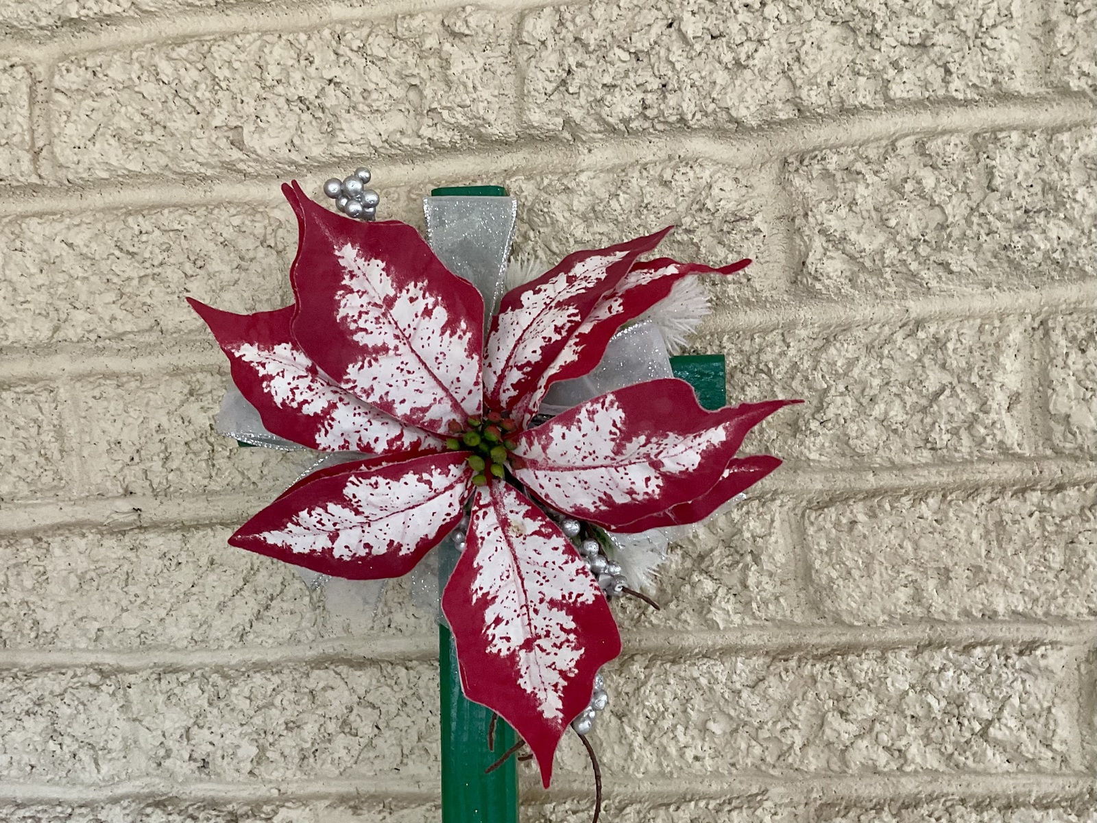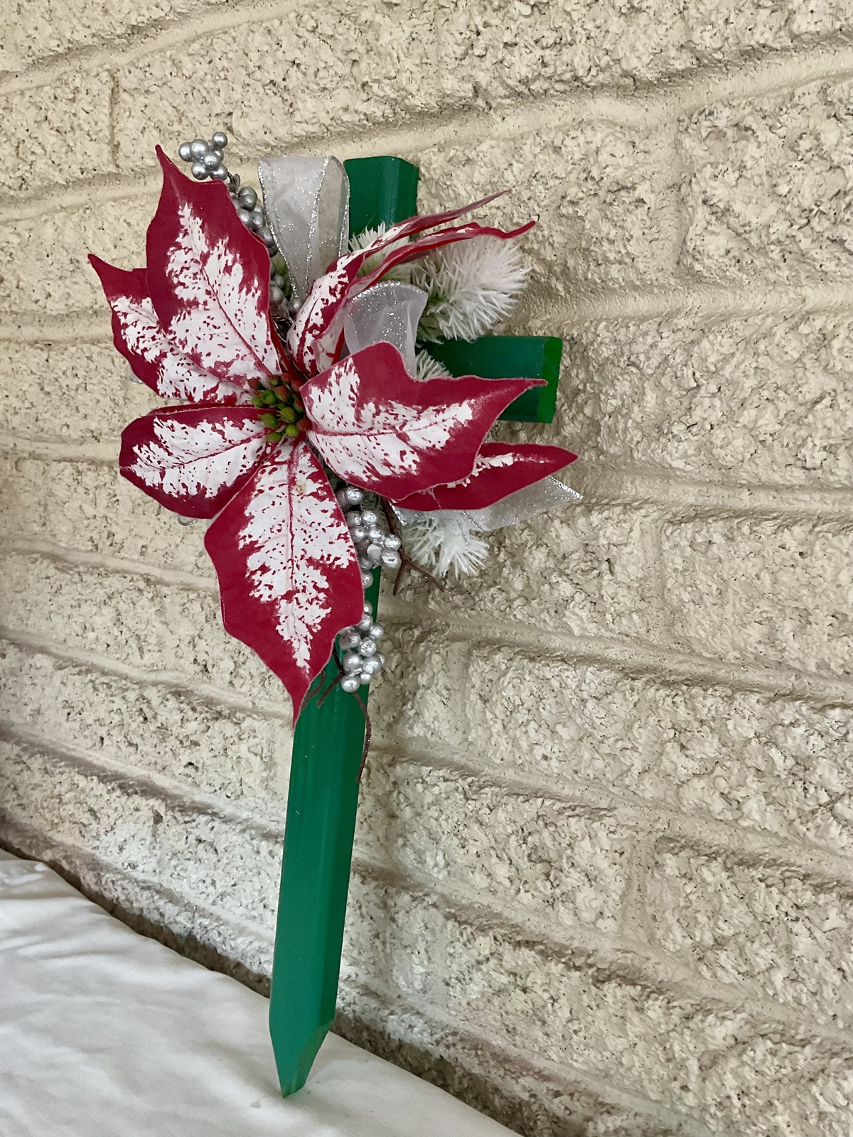 This 18” pine cemetery cross has been pai ted Christmas tree green with a very large candy cane poinsettia, silver berry branches, snow covered fir branches, and silver ribbon. The cross has a pointed end for easy ground insertion. Every cross is sprayed with a coat of clear polyurethane to protect the ribbon and silk flowers from outdoor elements.