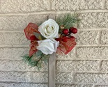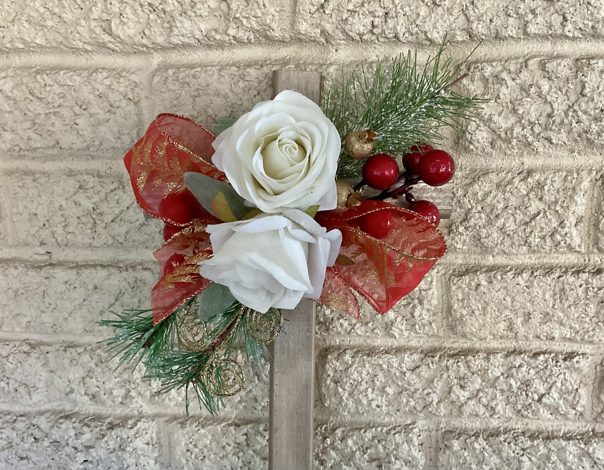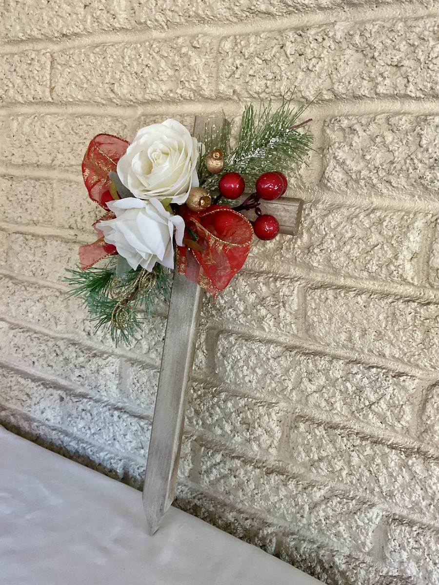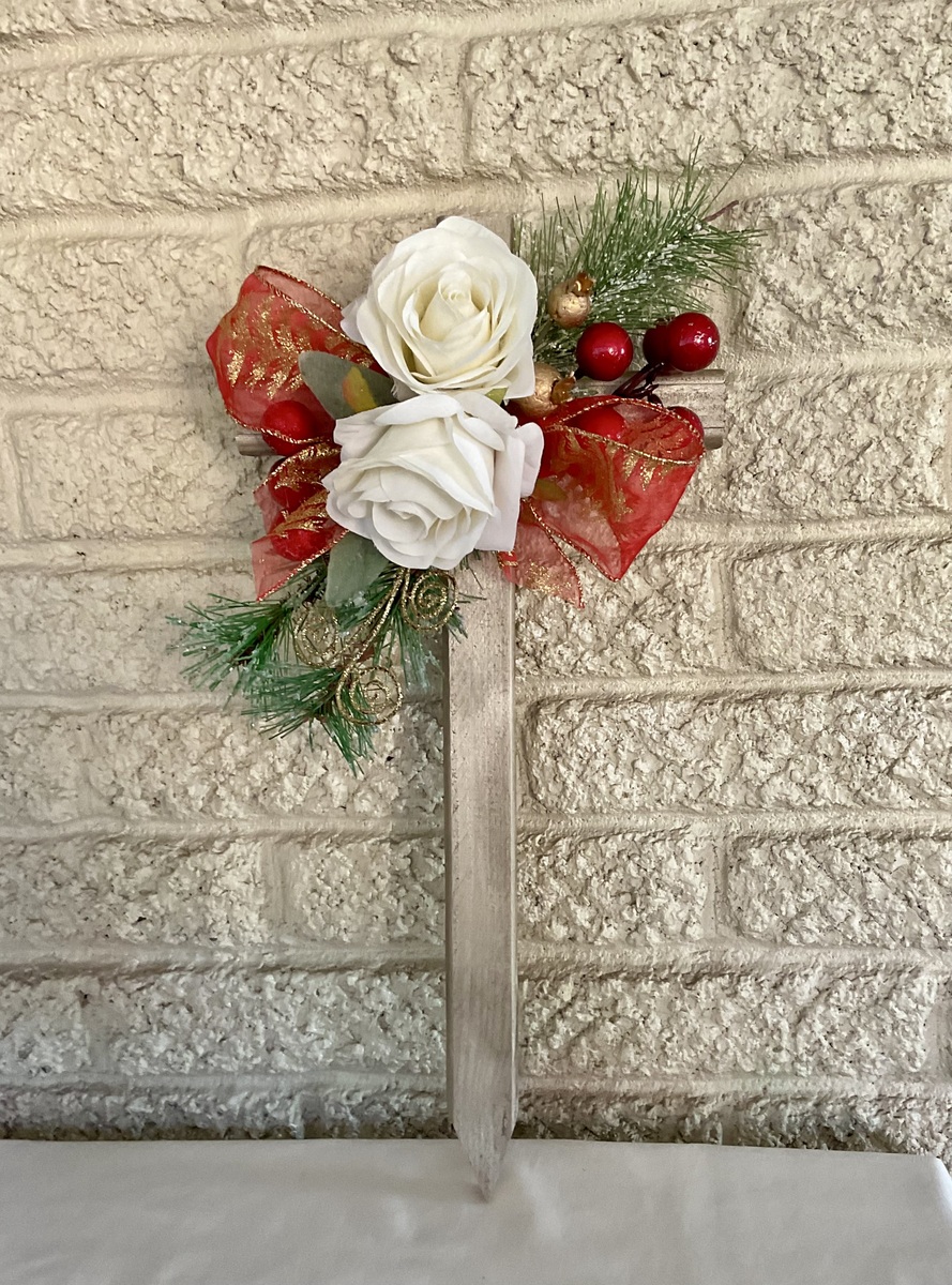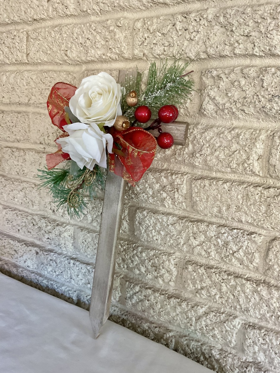 This 18” pine cemetery cross has been painted a metallic color with two cream roses, layers of fir branches, large red berries, gold berries, a gold glitter pick, and red/gold Christmas tree ribbon. The cross has a pointed end for easy ground insertion. Every cross is sprayed with a coat of clear polyurethane to protect the ribbon and silk flowers from outdoor elements.
