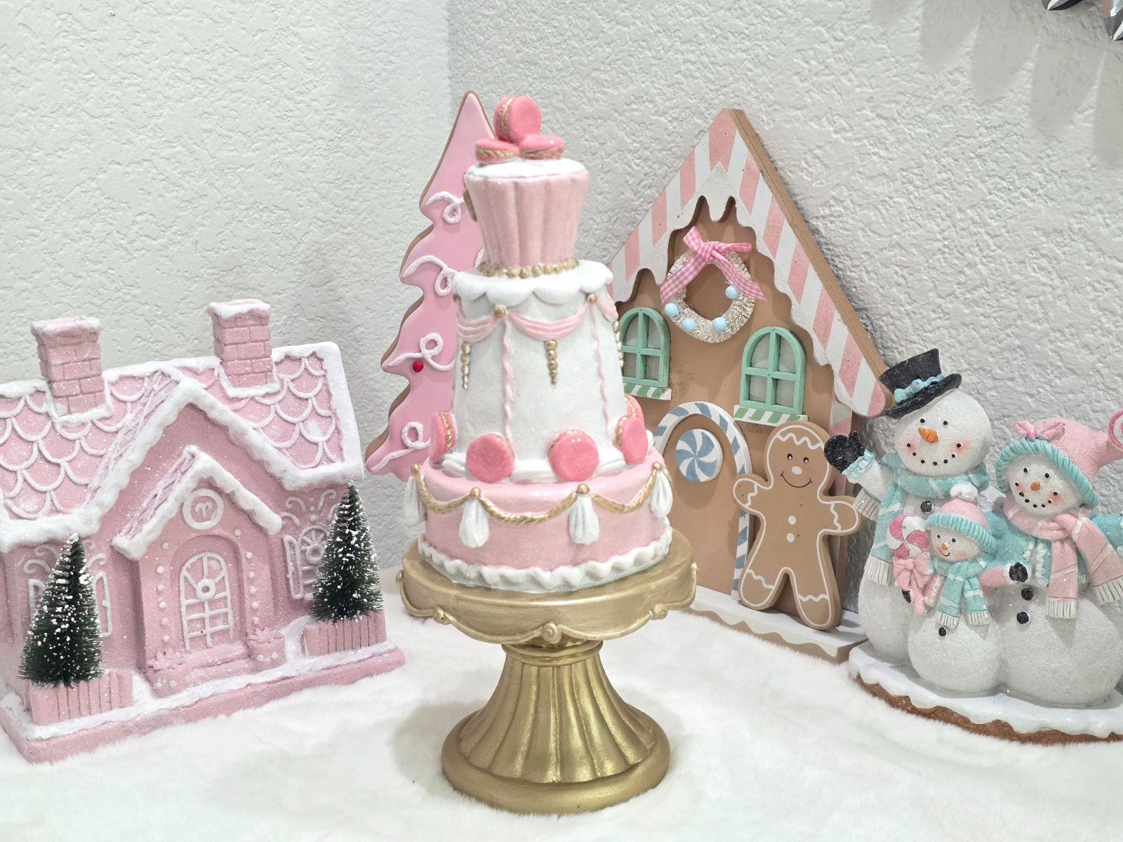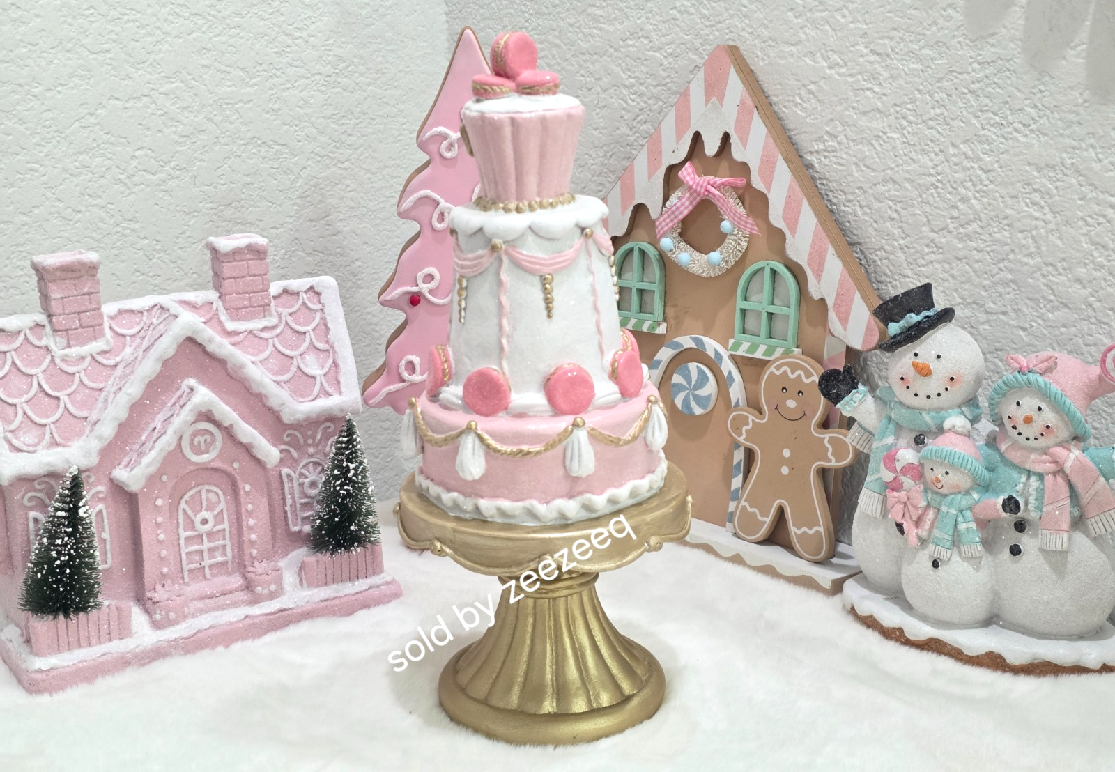 Christmas Gingerbread Pastel Pink Macaroons Pedestal Cake Figurine 12.5 NEW