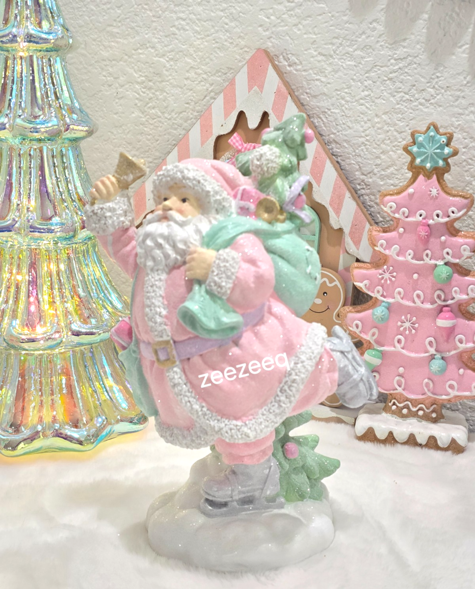 Up for sale we have this adorable pastel Santa Claus figurine for your holiday tabletop decor. Santa is pastel pink and mint green covered in glitter. Santa is having a grand time skating and holding his bag of presents. This piece is sooo cute and will look adorable any where you place him. It's made of resin and stands approx. 10.25" tall. NEW