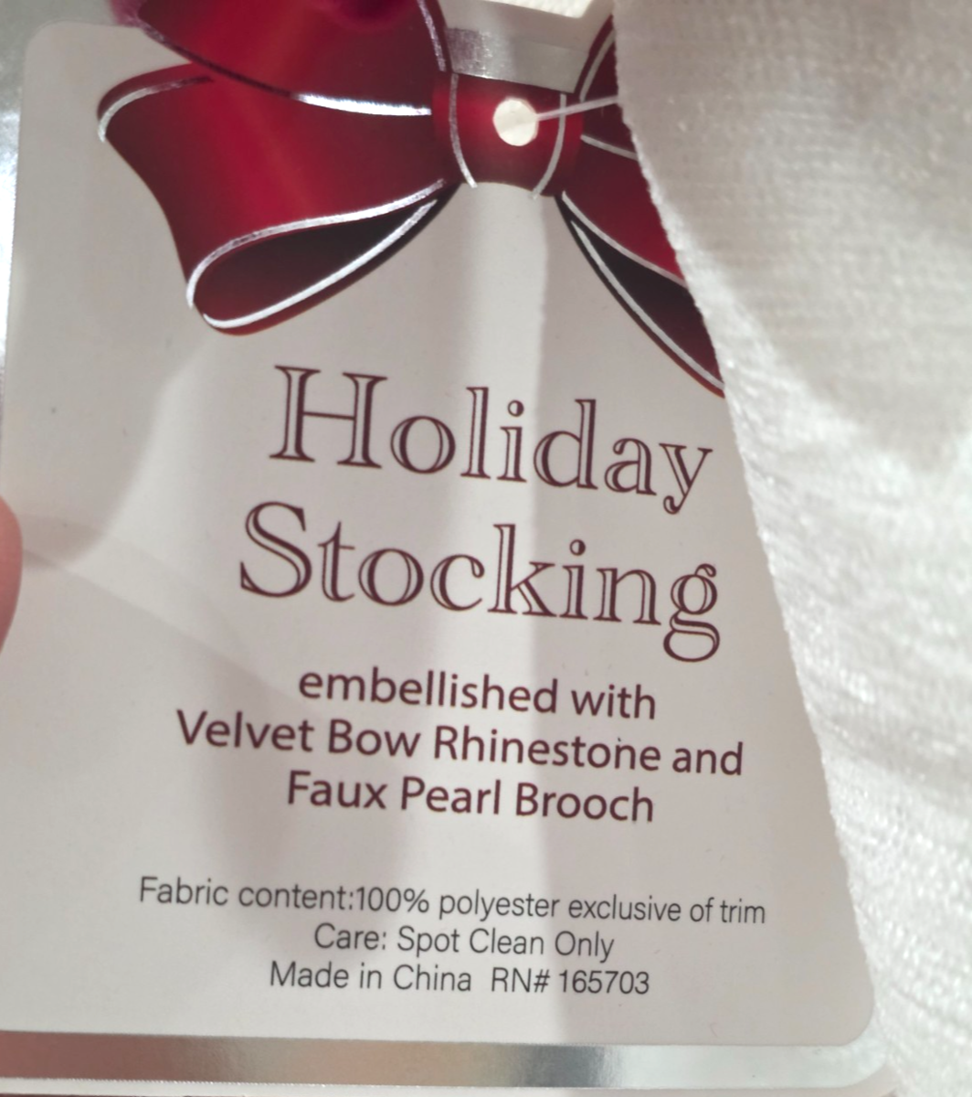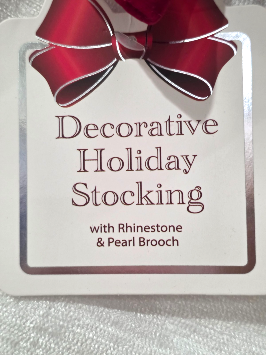 Up for sale we have this adorable elegant stockings for your holiday decor. This stocking will look amazing with your decor. It has a red velvet bow with rhinestones and pearls. NEW