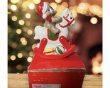 Introducing a vintage 1984 Ebeling Reuss teddy bear music box, titled "Christmas Ride". This adorable collectible features a glossy ceramic and porcelain finish in assorted colors, standing at a height of 6 inches with a width of 5 inches. The music box plays the tune "Toy Land" and is perfect for Christmas occasions or as a charming addition to your figurine collection.