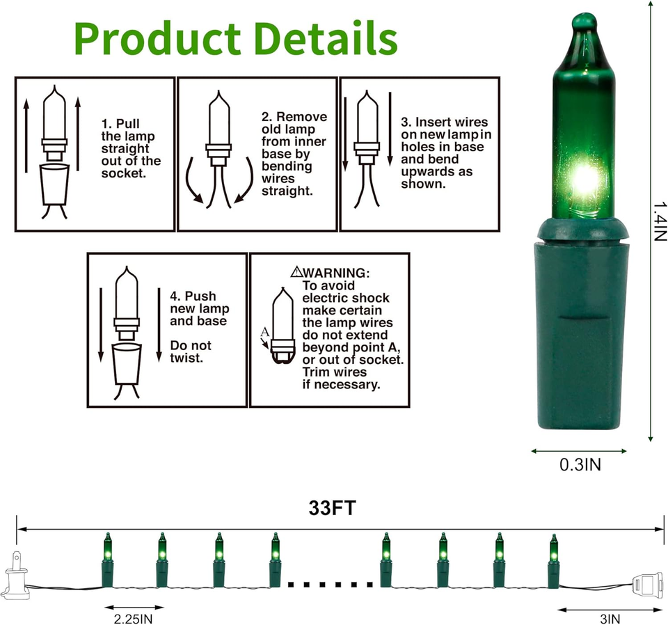 Green Wire Christmas Lights: Our 150 count green incandescent mini lights will light up you home in the coming up Christmas. Each bulb space 2.5in, 2.5V and 0.42W per bulbs, built-in 3A fuse for safe use. Extra bulbs and fuses are included. High quality UL certified products ensure the safety of you and your family.