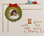 Christmas Victorian Greeting Card Holly Wreath Embossed 1900s Postcard PCBG11E