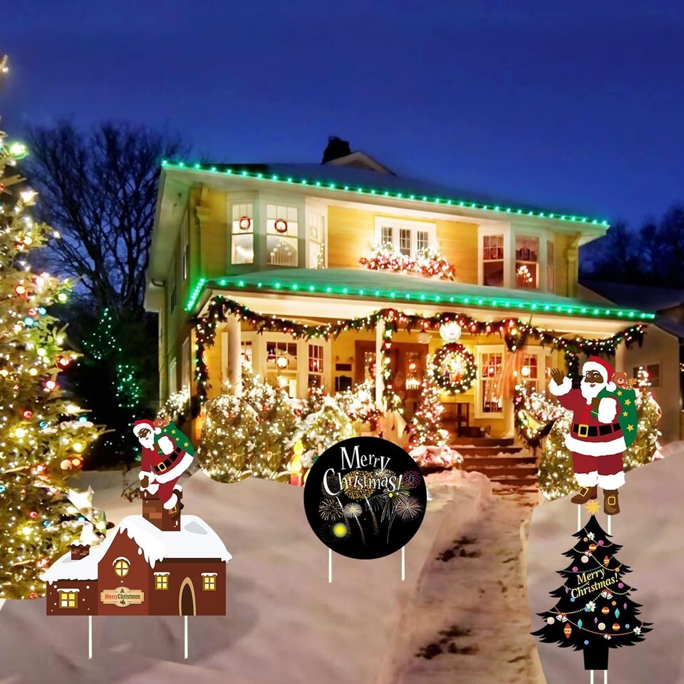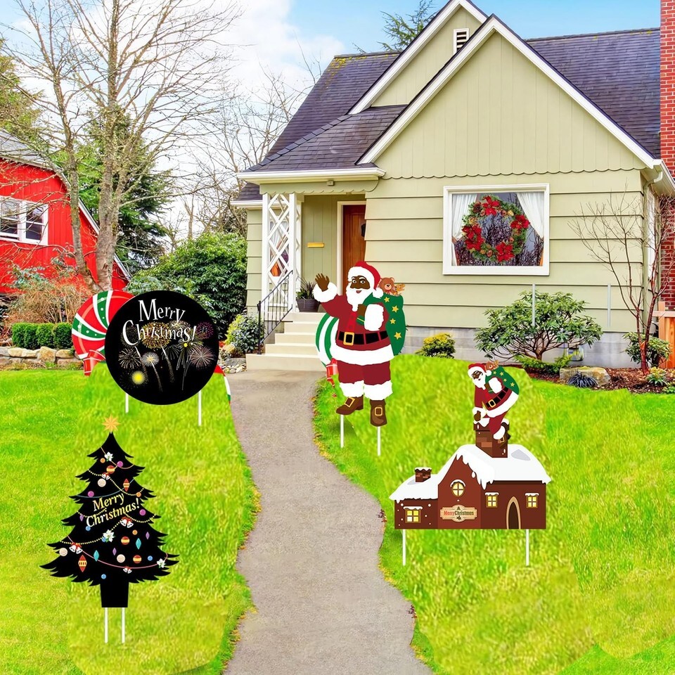 Bring the festive spirit to your outdoor space with these Christmas Outdoor Decorations! The set includes a striking black Christmas tree, a jolly Santa Claus figure, and vibrant Christmas fireworks yard signs. These durable lawn ornaments are perfect for decorating your garden, pathway, or front yard during the holiday season. Made from high-quality materials, they can withstand outdoor conditions and add a touch of cheer to your home. Easily set up and remove, these decorations allow you to create a magical Christmas atmosphere without hassle. Celebrate the joy of the holidays with this eye-catching outdoor decor set.
