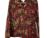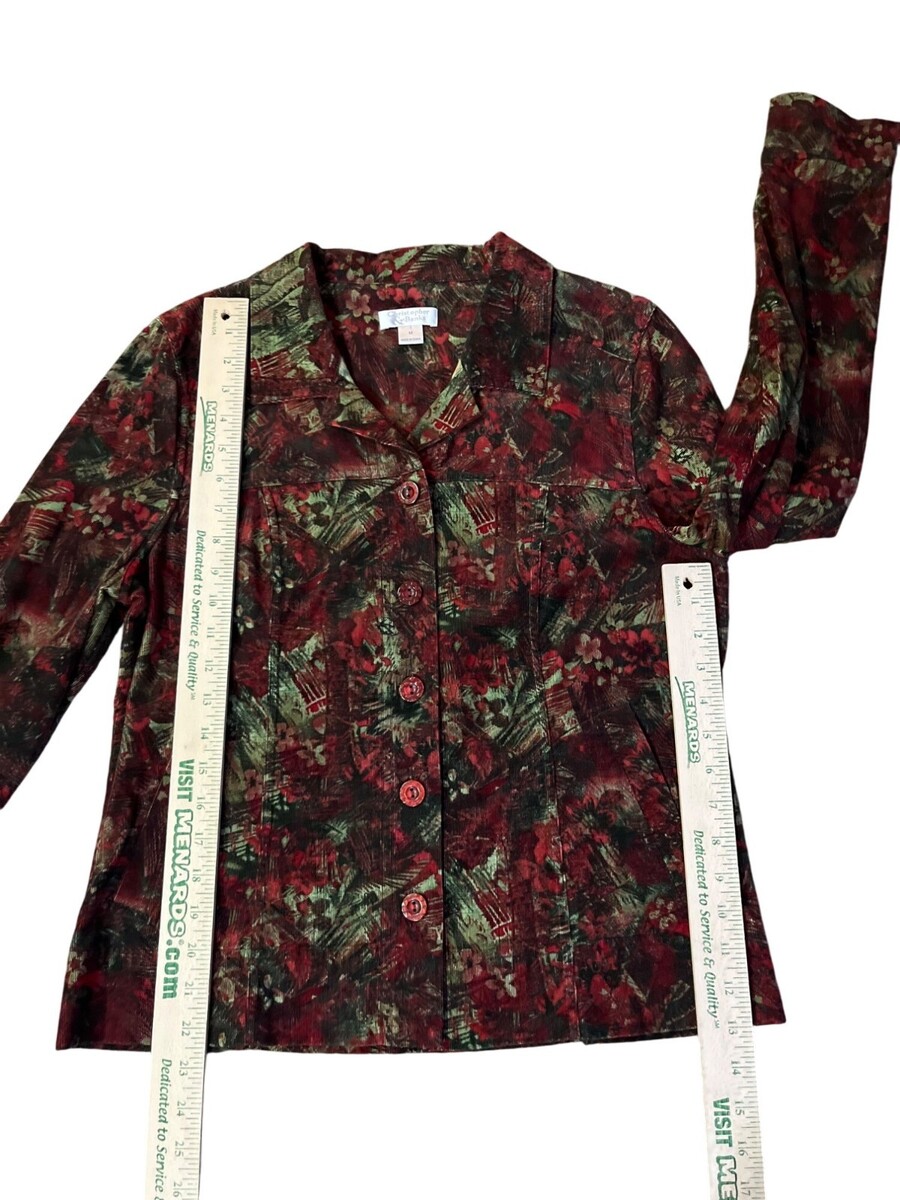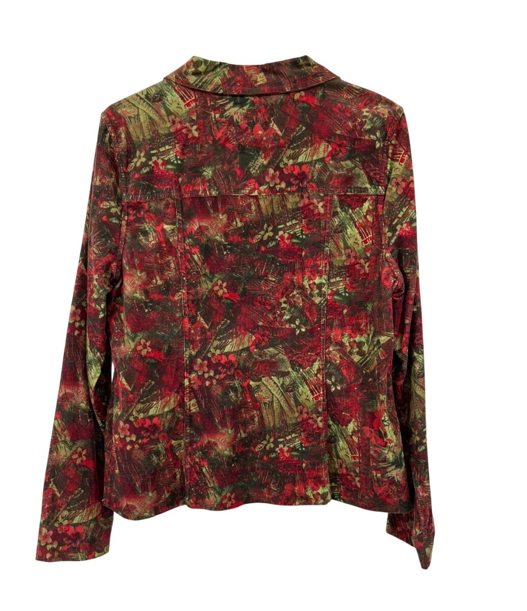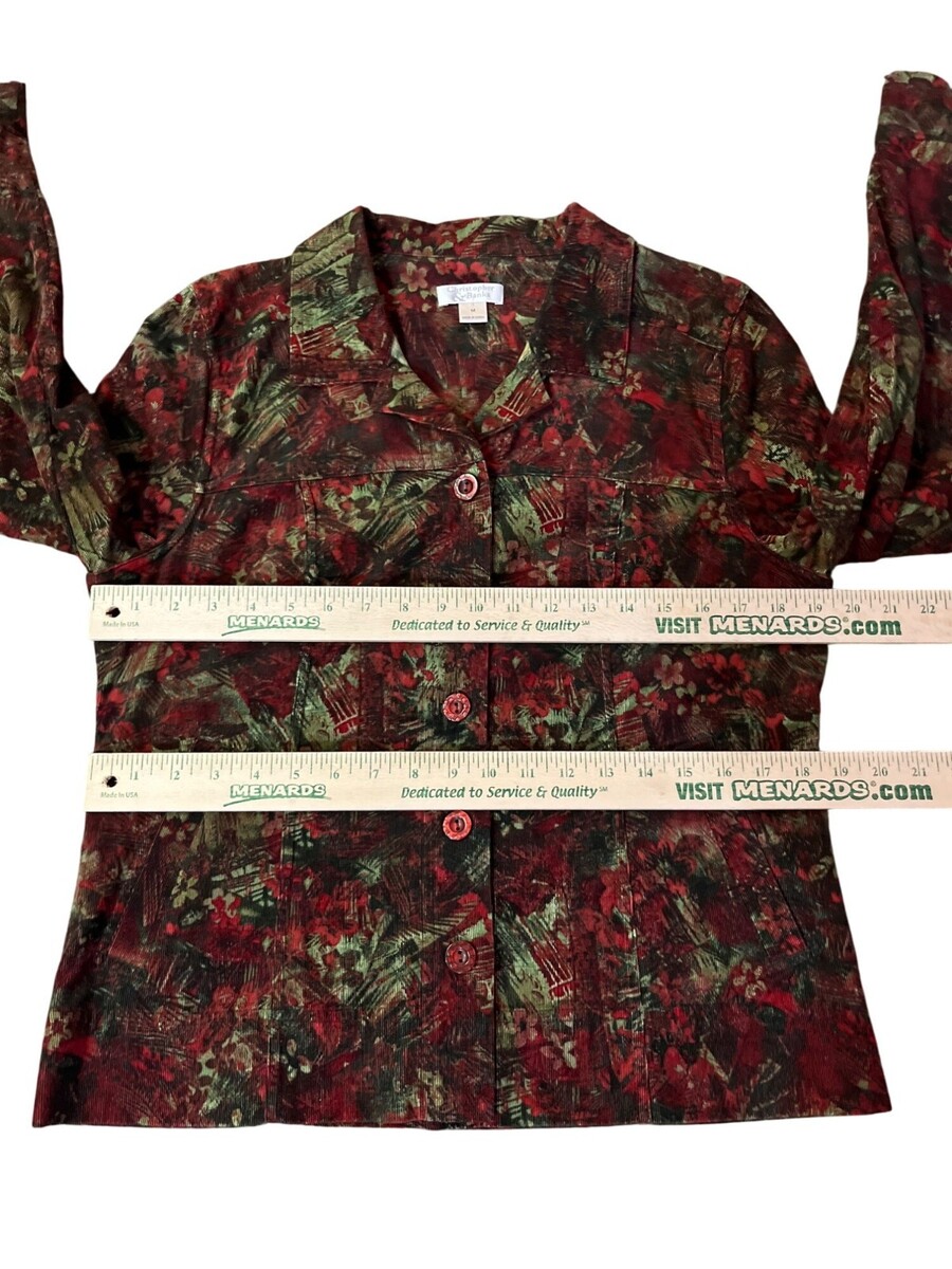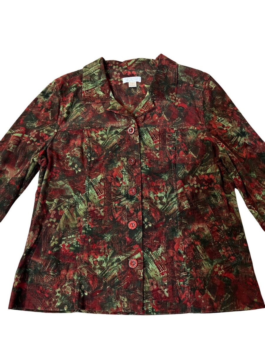 christopher banks, womens jacket, corduroy jacket, medium, red green, floral print, button front jacket, 100% cotton, holiday jacket, fall fashion, casual coat, vintage 2006, lightweight corduroy, machine washable, classic style, Winter, layering