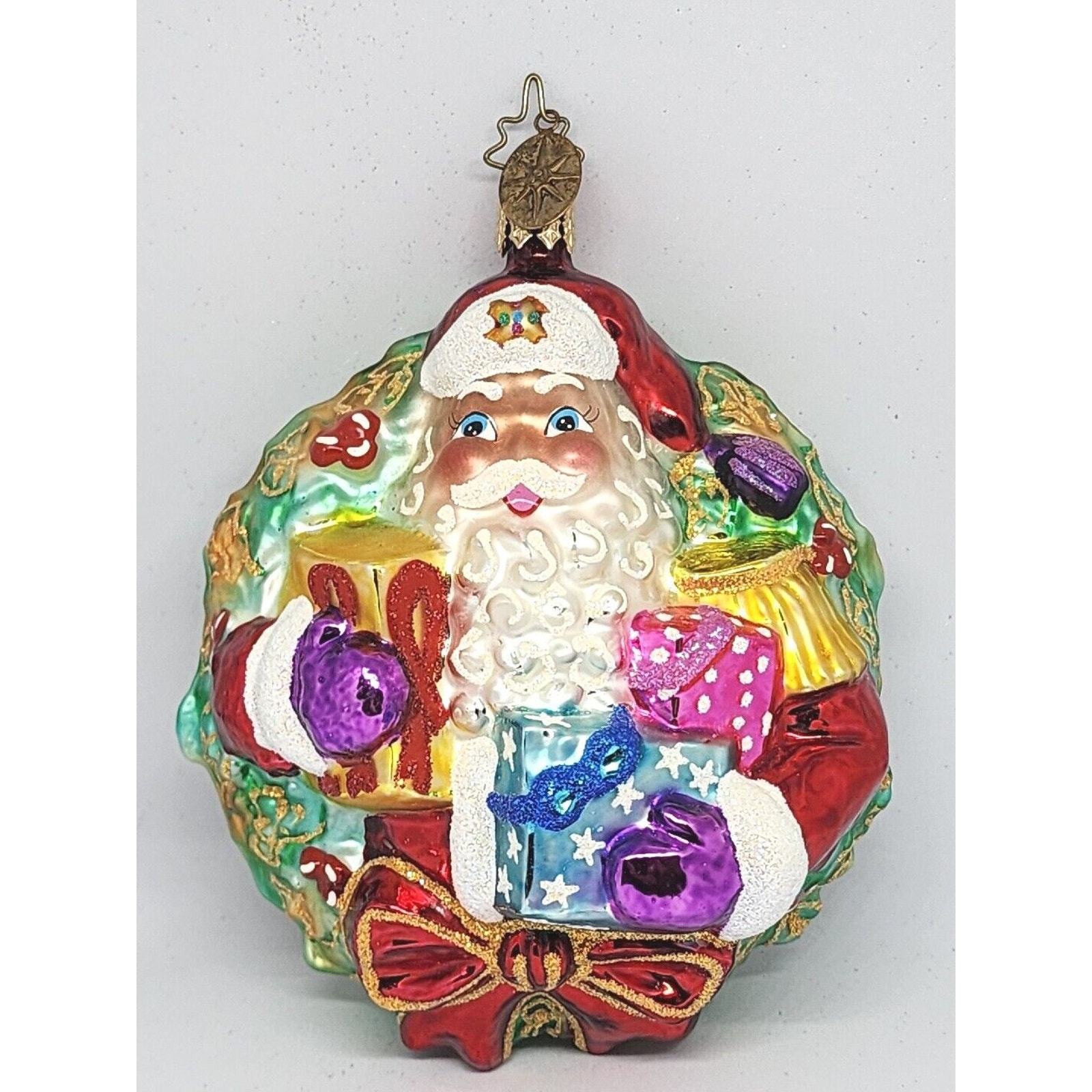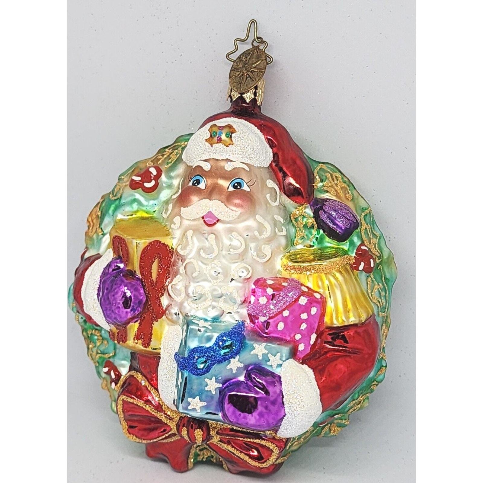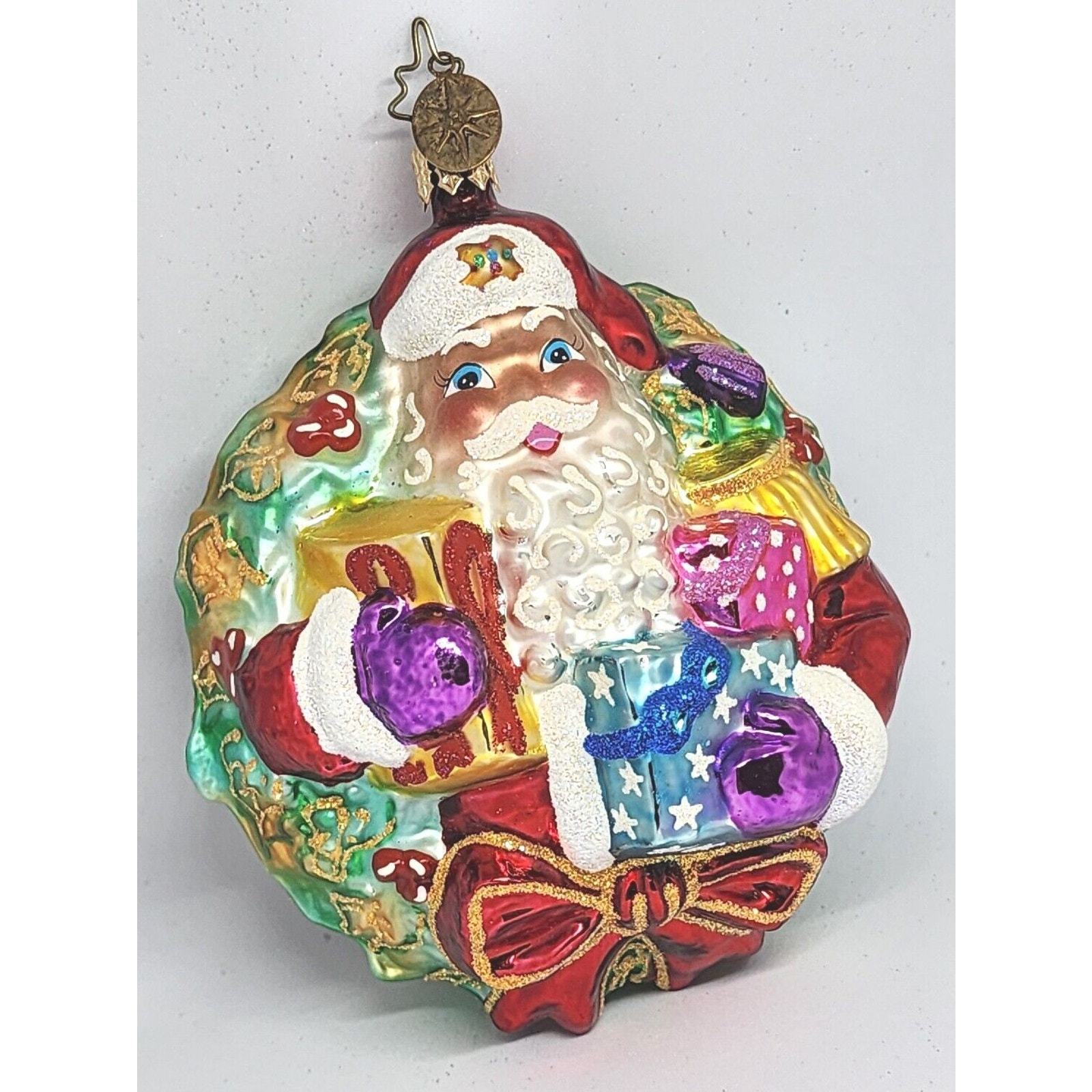 - Christopher Radko A Gift For Giving Santa Wreath Glass Christmas Ornament 5”