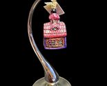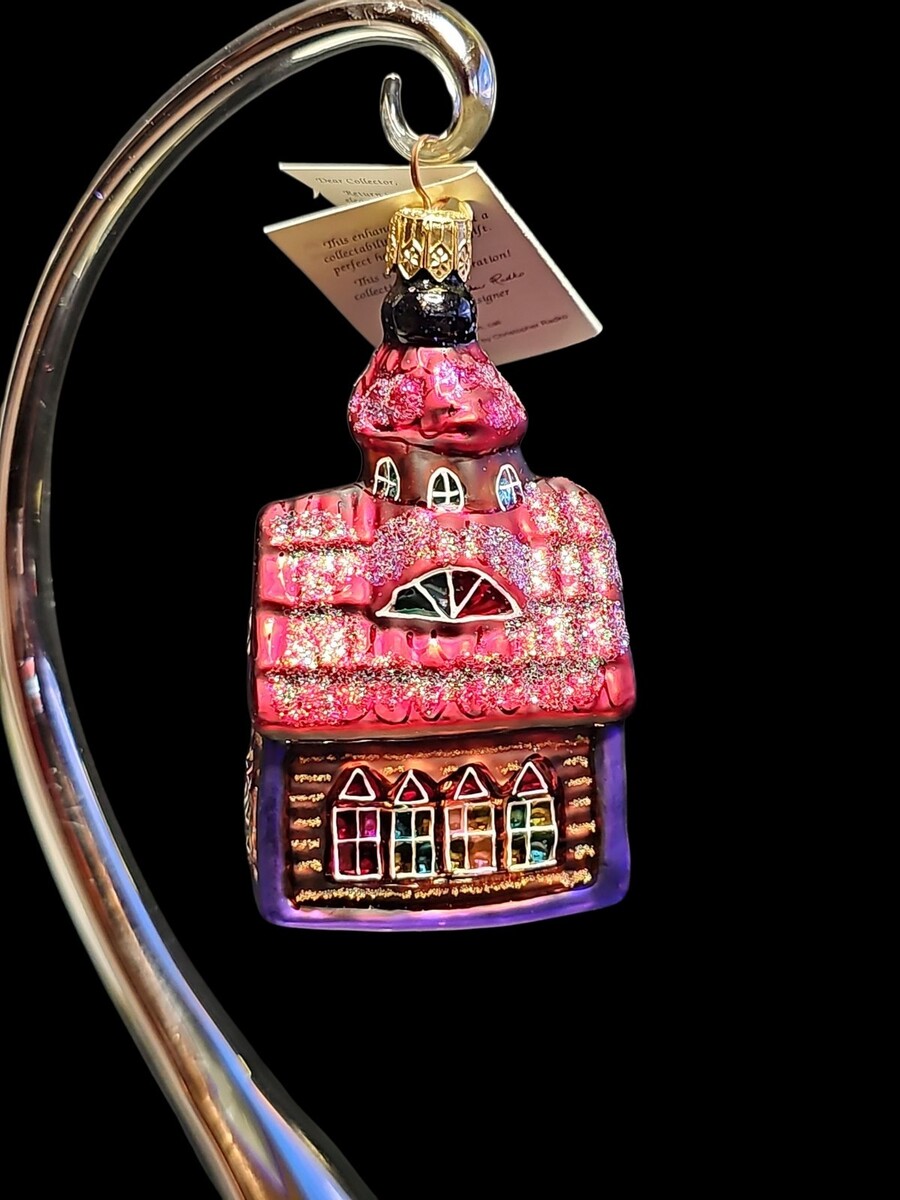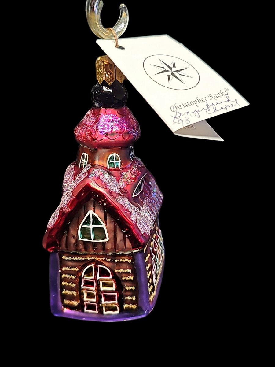 Whimsical and rare, this Christopher Radko ?Gingerbread Chapel? ornament was released in 1998 and is a standout in the Radko gingerbread village series. Featuring a textured pink frosting roof, peppermint finial, candy cane accents, and stained-glass-inspired windows.