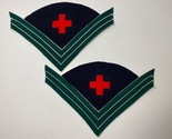 The chevrons are individual strips of green wool sewn onto a dark blue quarter inner circle, with a 2?x2?red wool cross within the center. A complete unissued, unused chevrons with no moth nips. White chain stitching.