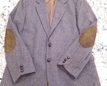 See photos for measurements as the item may have been altered. I believe this is wool, but I can't find a fabric content. Brown with reddish plaid/glen plaid pattern. Inside lining is marked/discolored as shown. Has suede type elbow patches.