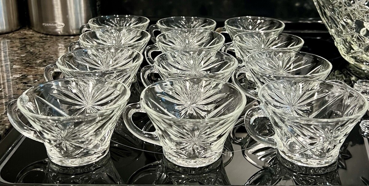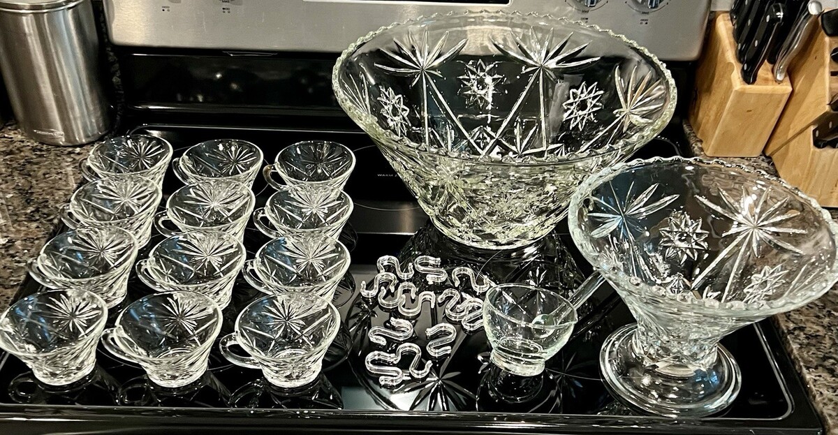 The Circuit 1960s Anchor Hocking glass early American Prescut 27 piece punch set is a vintage punch bowl set made of high-quality glass by the renowned brand Anchor Hocking. This set, manufactured in the 1960s, includes 27 pieces and is designed in an early American Prescut style, adding a touch of elegance to any dining or entertaining setting. Perfect for serving and enjoying cocktails or other beverages in style, this punch set is a must-have for collectors and those who appreciate the charm of retro decor.