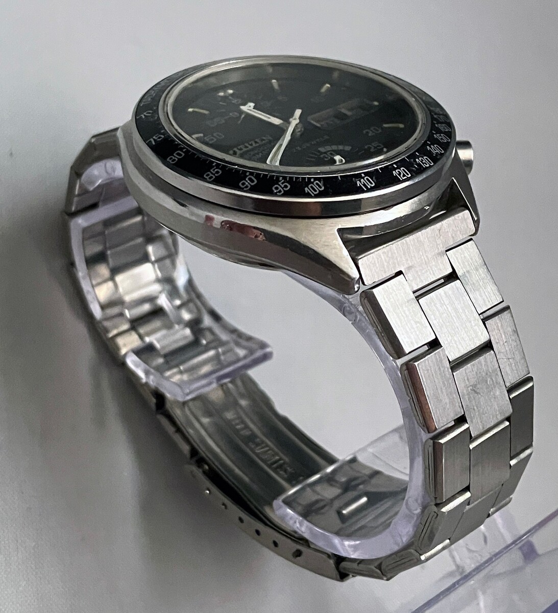 Shows age on dial - some fading. Citizen bracelet fits approximately 7.25" wrist (very tight onmy 7.5").