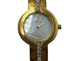 The Citizen Eco-Drive Watch for women, model B023-D16209, features a white dial with a mother of pearl pattern and stick indexes. This classic timepiece has a gold stainless steel case and bracelet, with a water-resistant 12-hour quartz movement. With a maximum wrist size of 6.25 inches and a polished finish, this elegant watch is perfect for both dress/formal and casual occasions. The oval-shaped case, adorned with a fixed gold bezel, exudes a timeless and stylish look that is sure to make a statement.