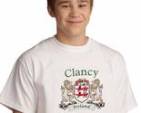 Product description: Clancy Irish Coat of Arms Tee Shirt in White. Every Irish family has a story to tell, probably hundreds of stories. Your Irish coat of arms is a visual record of your family's oldest, most significant stories. Here, they're told in bright, permanent artwork on these fine-quality, 100% cotton Gildan tee shirts. Over 25 years of heraldry research and over 1000 available Irish family coat of arms.
