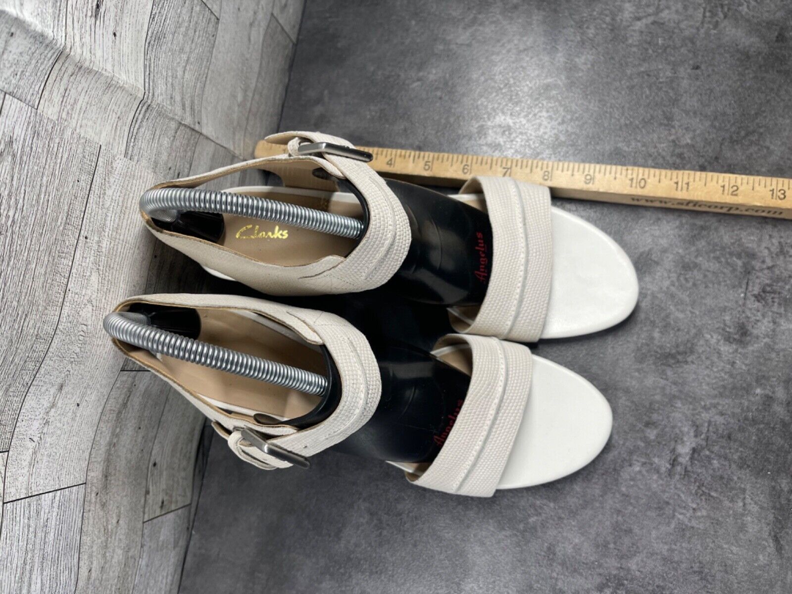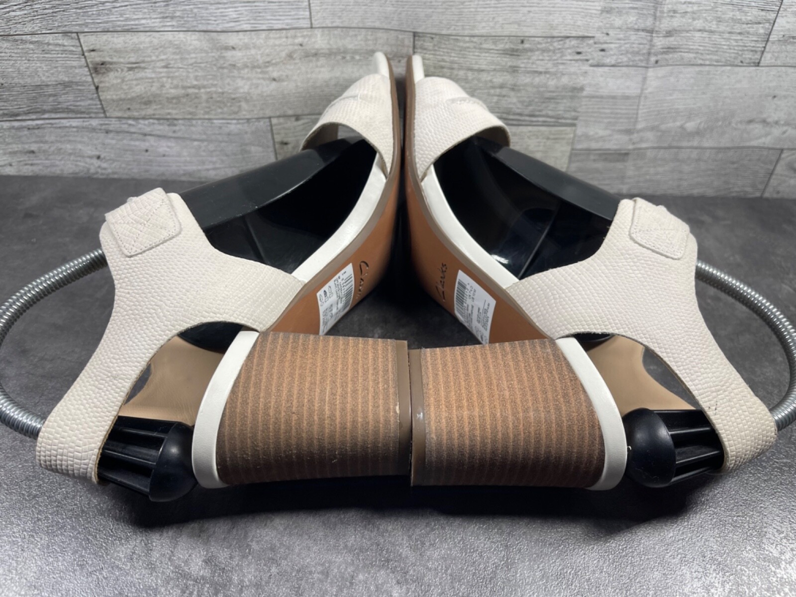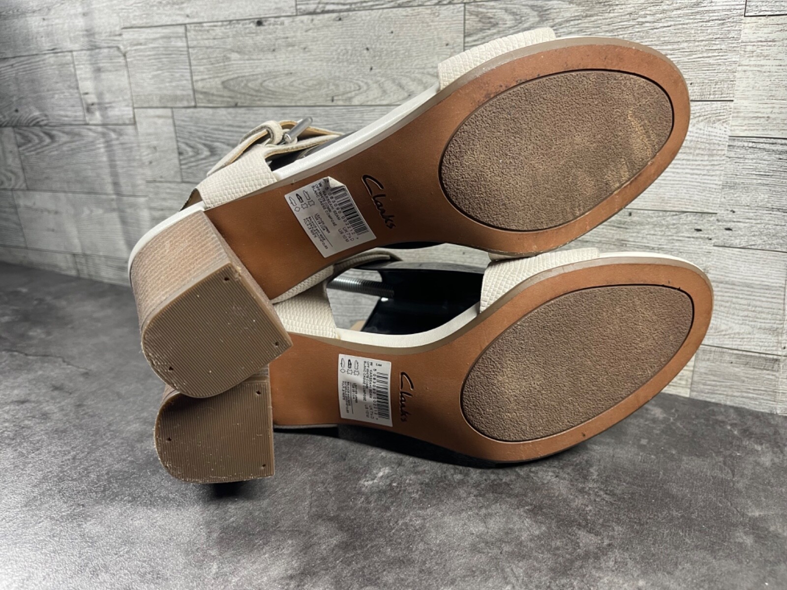 - Clarks Sandals Women 10M Karsea hi Seam Shoes White Leather Block Heel Slingback