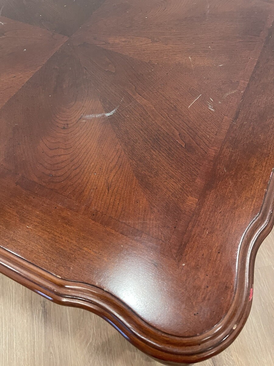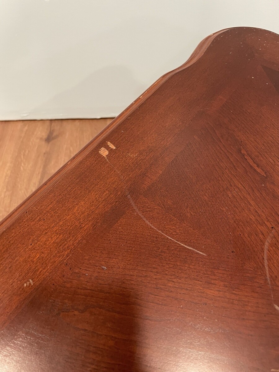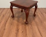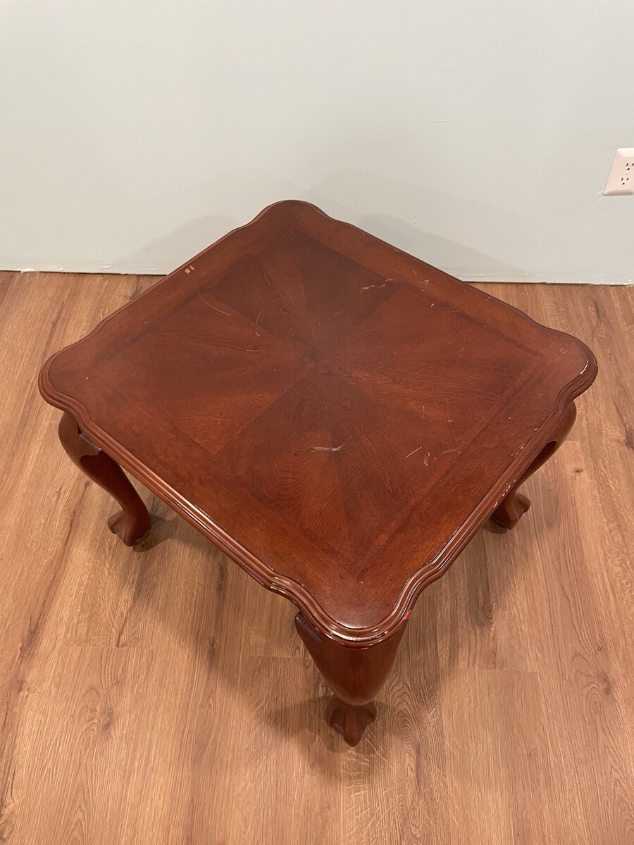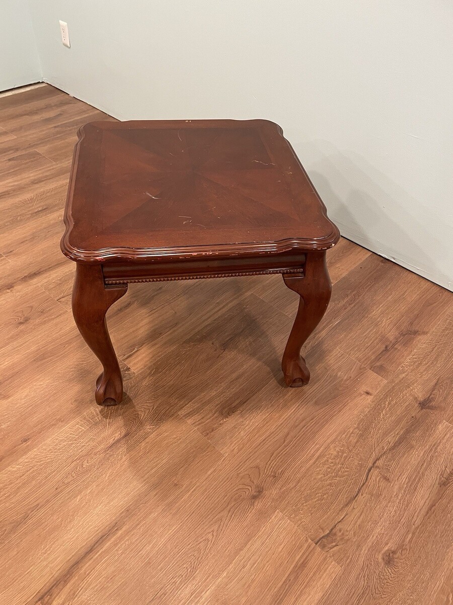 For sale is a newer vintage style wood end table with ball and claw feet. It has some scratches as shown. Very solid construction.