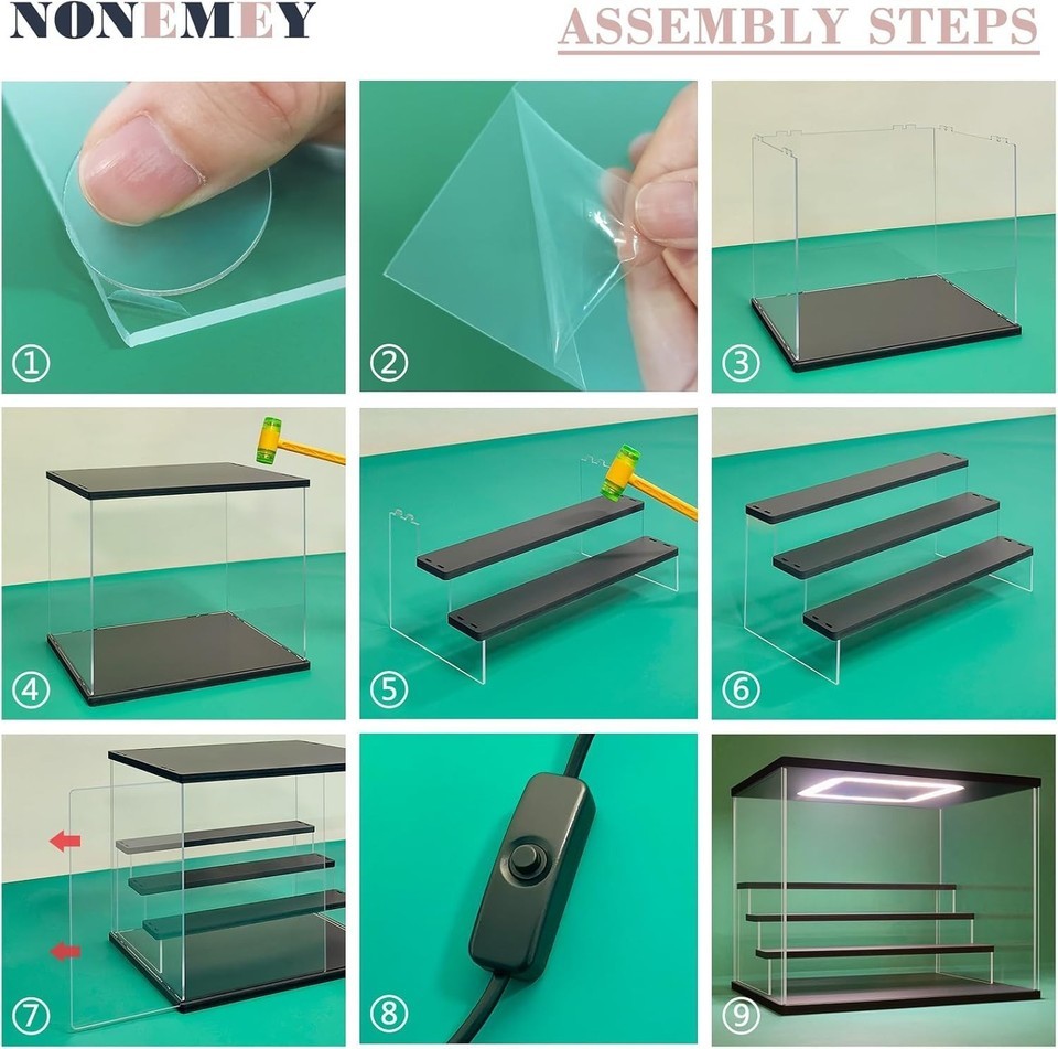 Features: With LED Light,Dustproof,Sliding Doors,LED light illumination,Dust protection,Sliding doors for easy access,Smooth edges for safety,Easy to assemble,High-quality acrylic material,Multiple tiers for display