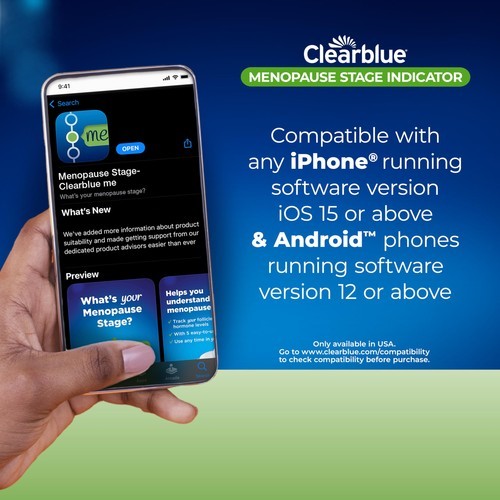 SCAN the QR CODE on PACKAGE INSERT to download the Menopause Stage Clearblue me app, which is subscription-free with no in-app purchases. Compatible with most iPhones Android Phones running on latest major operating system (OS) one previous