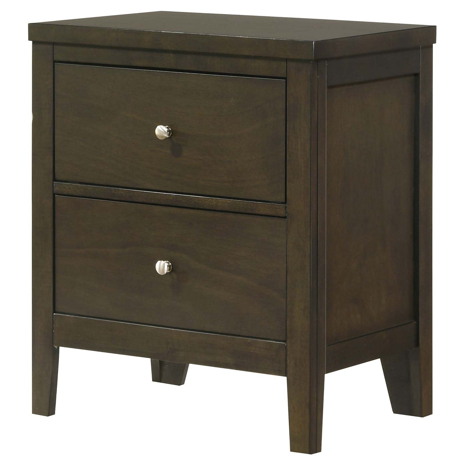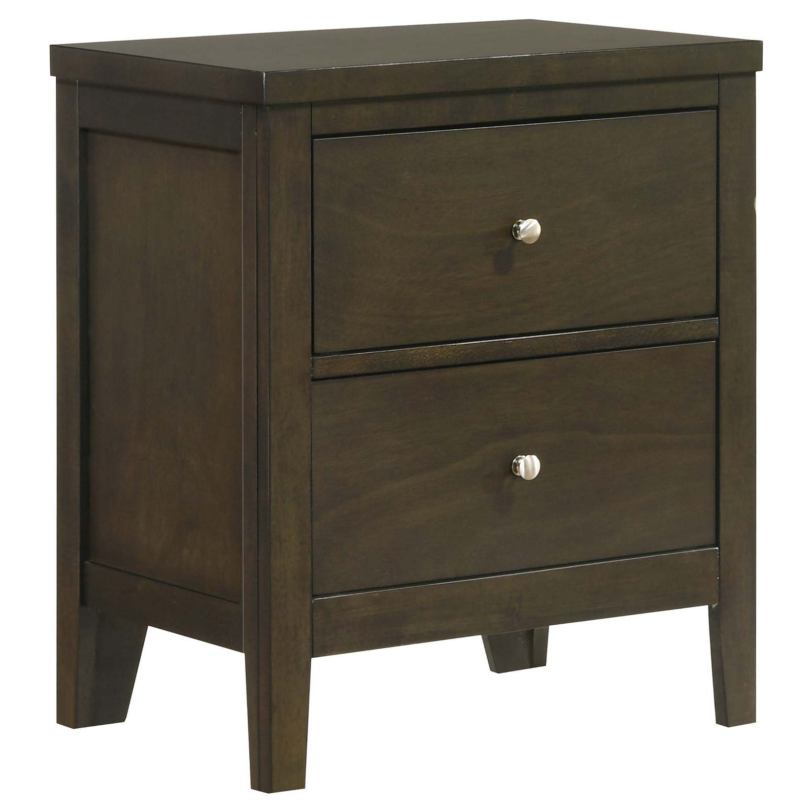 Bedside routines stay tidy with this dark cocoa two-drawer nightstand, pairing a roomy surface for a lamp or book with deep storage beneath. The clean silhouette suits many styles, the sturdy wooden build stands up to daily use, and brushed nickel hardware adds a simple highlight.