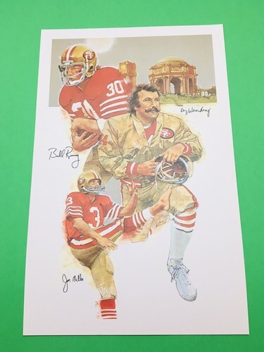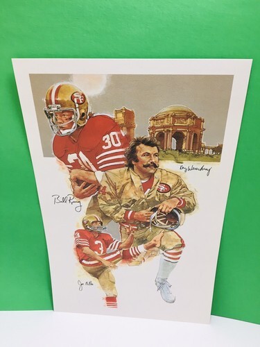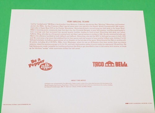 This is one of four different painted prints commissioned by Taco Bell Dr. Pepper for Artist Cliff Spohn to Paint some of the key players of the World Champion San Fransisco Forty-Niners. Cliffs artwork is very popular and has painted for some major companies in the past. Companies such as, ABC-TV, ATARI, Levi-Strauss, The National Football League Milton Bradley, and more. This can be framed and will look amazing in a sports themed room. The print measurements are above in the pictures.