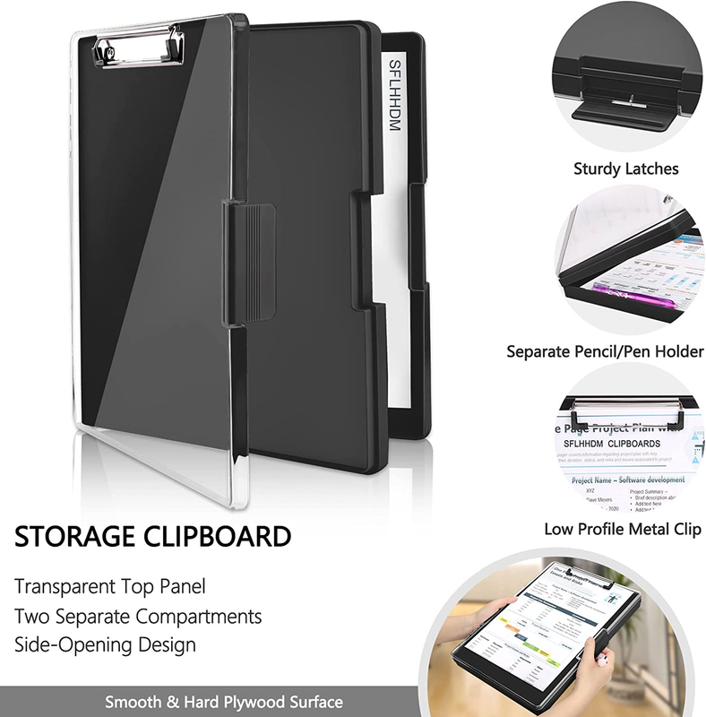All-In-One Storage Clipboards: Dual-Layer design ensure roomy space for various needs of storage.You can keep frequently used documents on the top compartment. A second lower compartment is deep enough to store more than 300 sheets. Separate pen/pencil case for pens, markers, and other small items