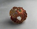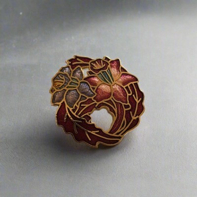 This elegant brooch features a circular floral design crafted in the cloisonne style, with intricate enamel in rich shades of red, gold, and soft lavender. The flowers are outlined in fine gold tone, creating a striking contrast that highlights the delicate details. The back has a textured gold tone finish with a secure pin clasp for easy wear. A timeless accessory, perfect for adding a touch of vintage charm to jackets, scarves, or hats.