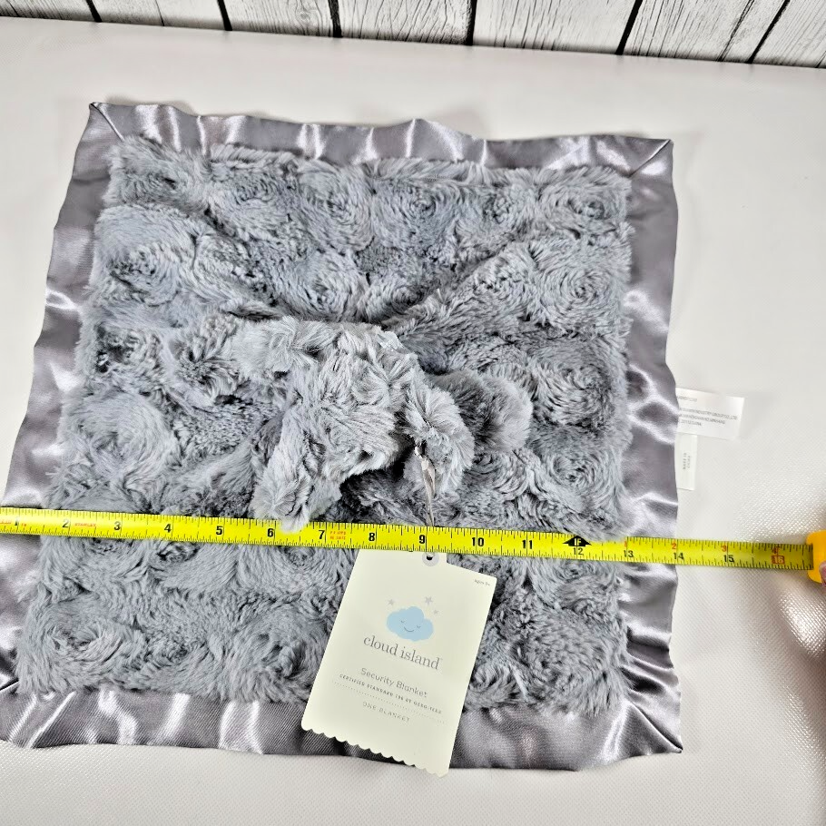 This brand?new with tags Cloud Island elephant lovey offers soft plush comfort combined with satin trim, perfect for baby snuggles or nursery decor. Sized at 14" x 14", this gray elephant security blanket adds a cozy touch of charm and quality to any baby registry.