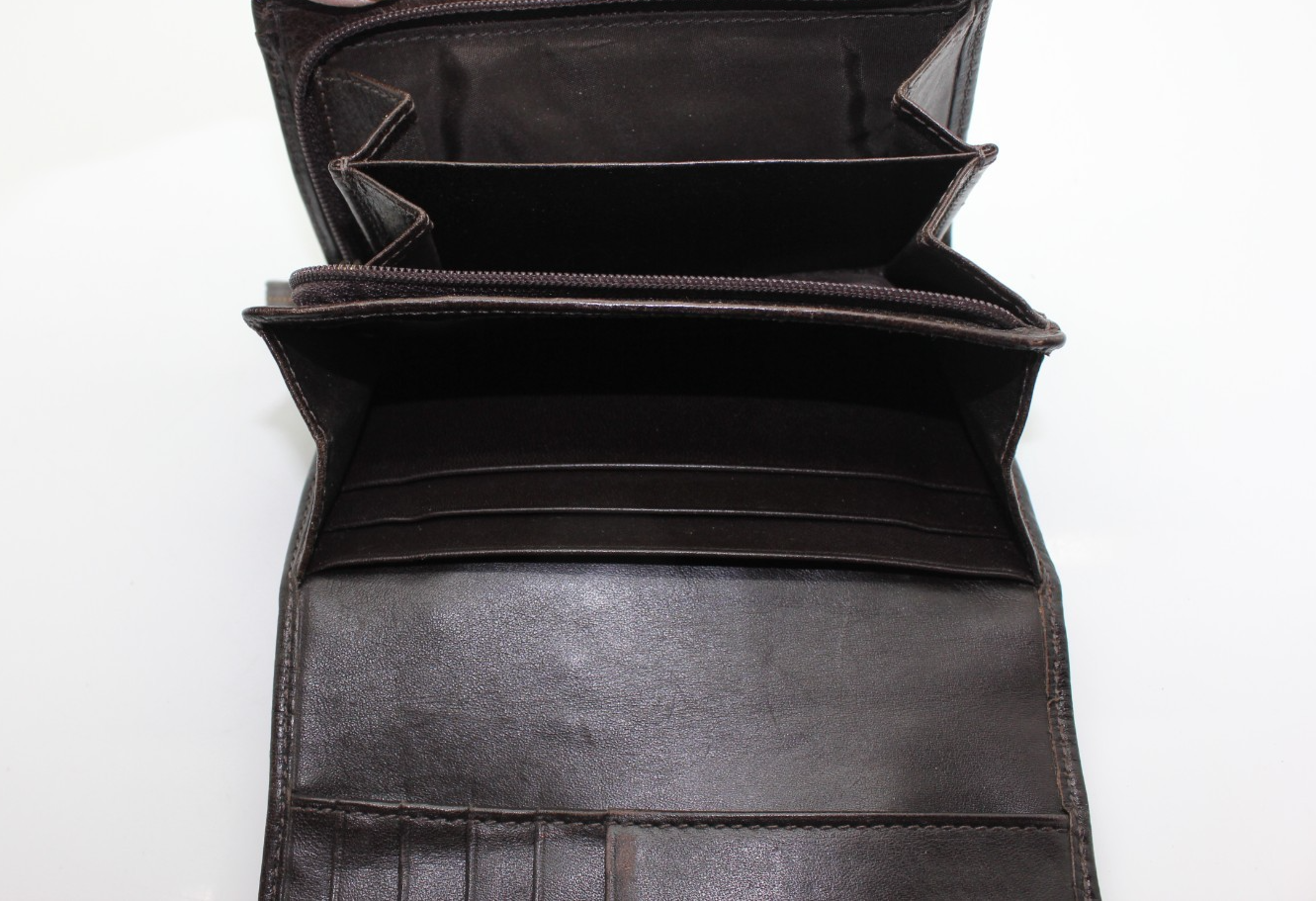 Interior: 5 Credit Card Slots, 4 Medium slip pockets, Zip Around Divided Coin Pocket, 2 Outer Slip Pockets, 1 Bill Fold Pocket