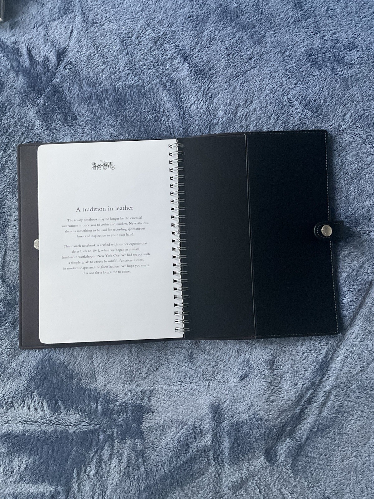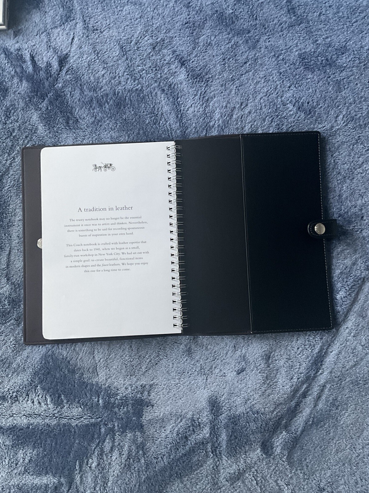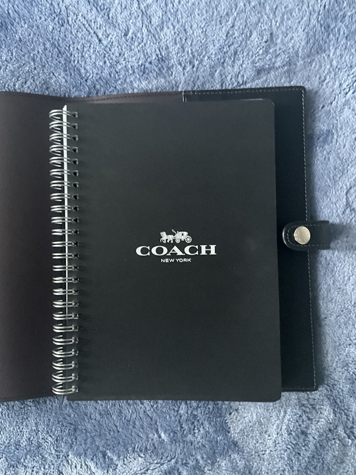 The Coach Notebook with Heart Bolt Print is a stylish and sleek accessory for both men and women. Made from smooth leather in black with silver accents, this notebook features a unique heart bolt print that adds a touch of personality to your everyday essentials. The unisex design and durable material make it a versatile and practical choice for organizing your thoughts and plans. Perfect for those who appreciate quality craftsmanship and a touch of luxury in their accessories.