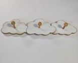 The Cloud Shaped Coat Rack Hanger is a stylish and modern accessory for your home decor. This wall-mounted coat rack features a unique cloud design, hand-painted in white with light brown accents. Made of wood-like material, this coat rack has 3 pegs for hanging coats, jackets, or hats. With an item height of 4" and length of 18", this functional and decorative piece adds a touch of elegance to your living space. Normal wear. Sizes are approximate.