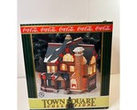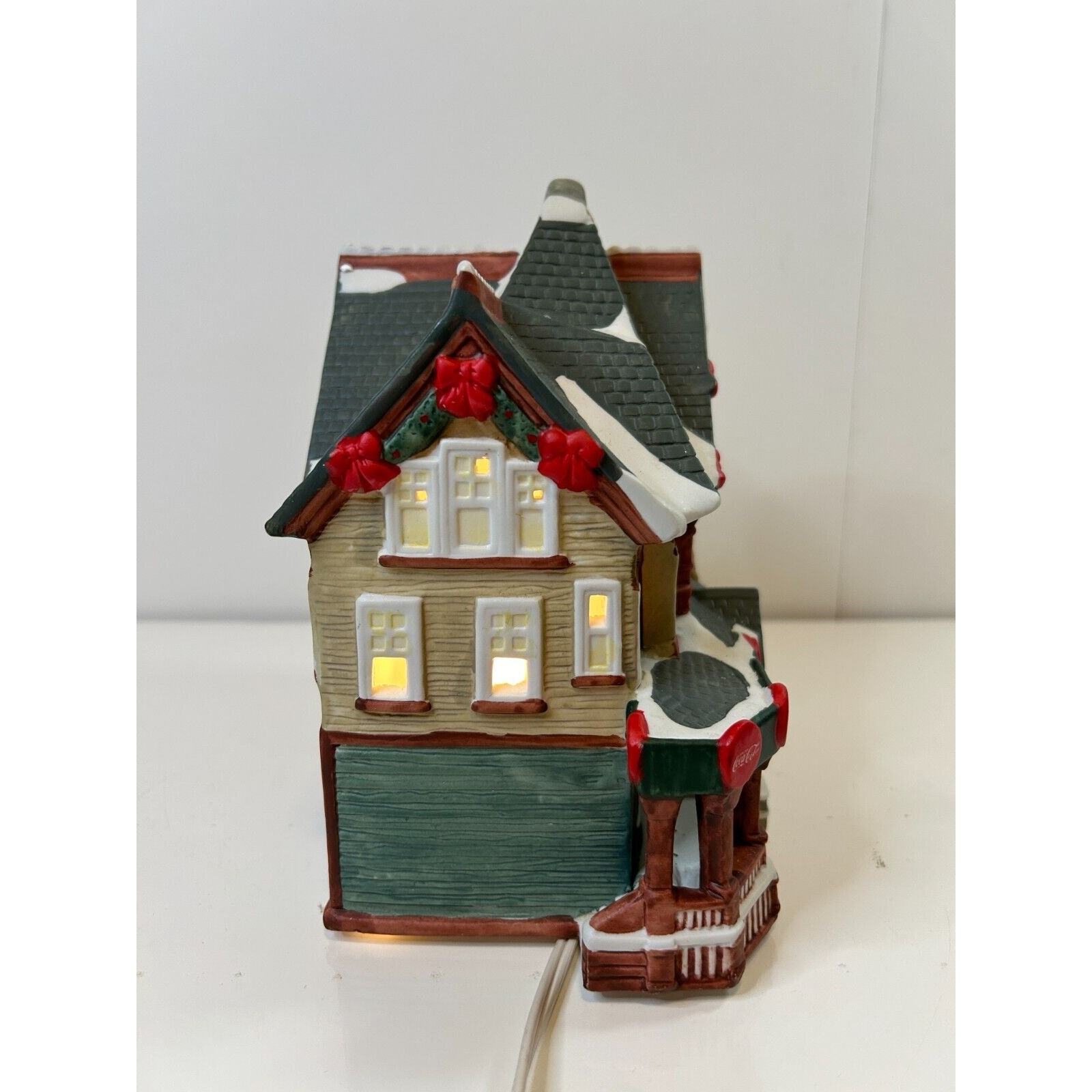 The building measures approximately 7" tall and includes its working light cord to create a warm seasonal glow. It comes in the original box and shows light wear consistent with age, but the piece itself remains in very good condition. A great addition to any Christmas village or Coca-Cola memorabilia collection.